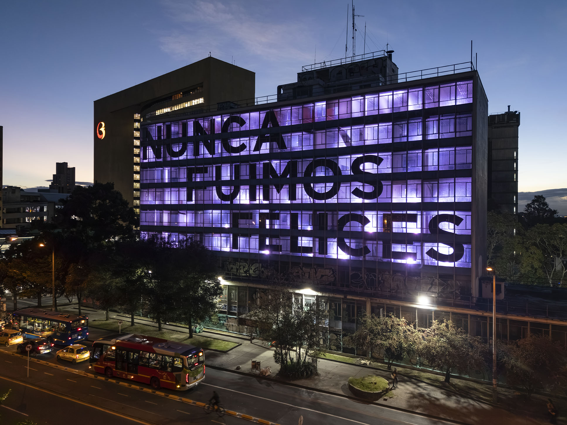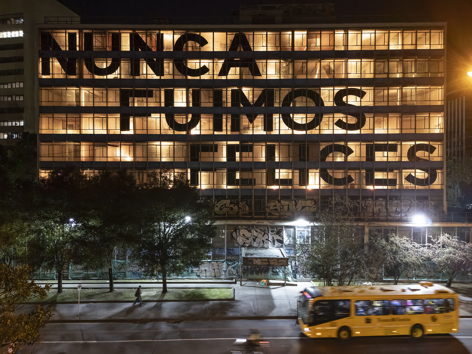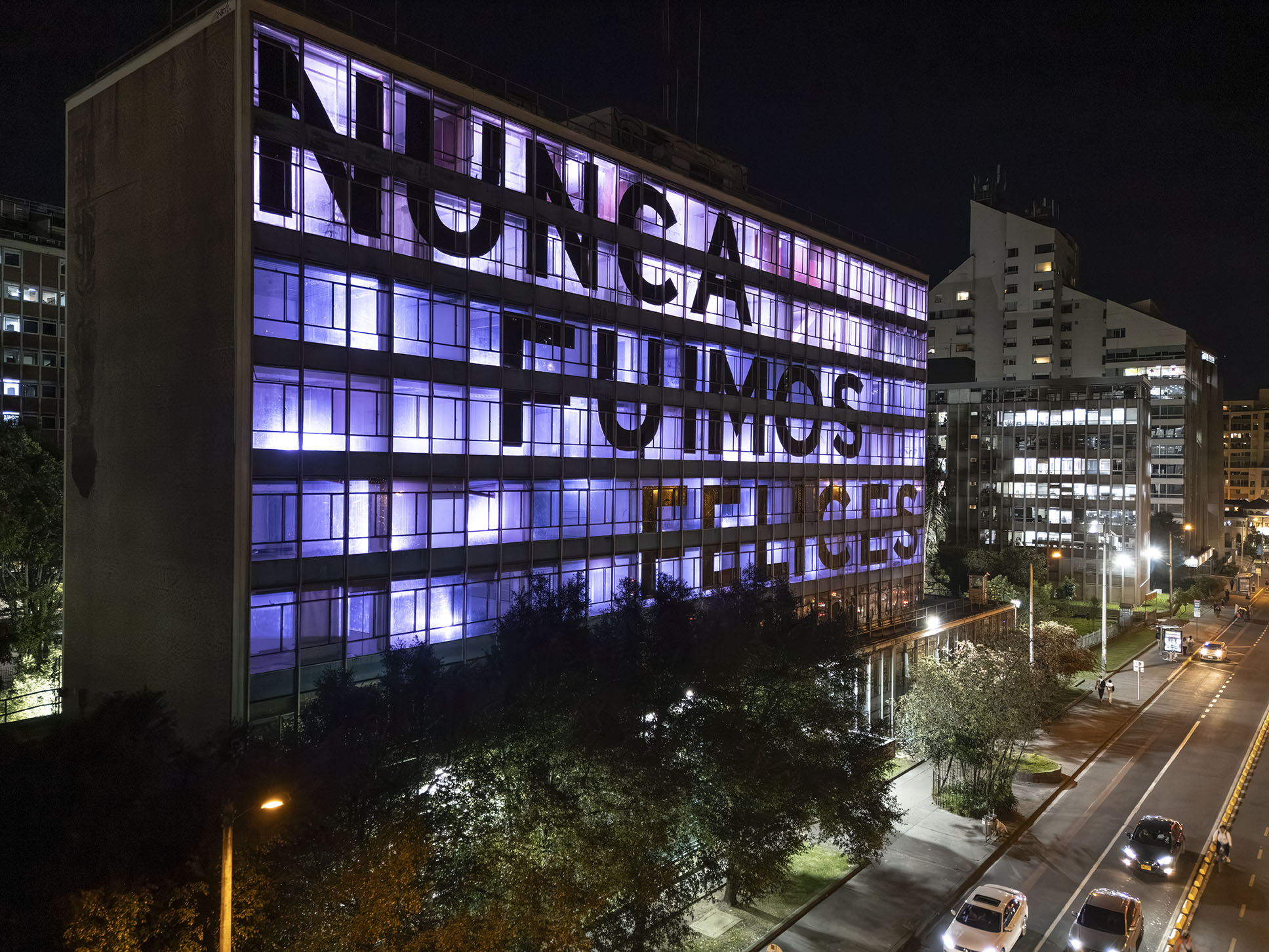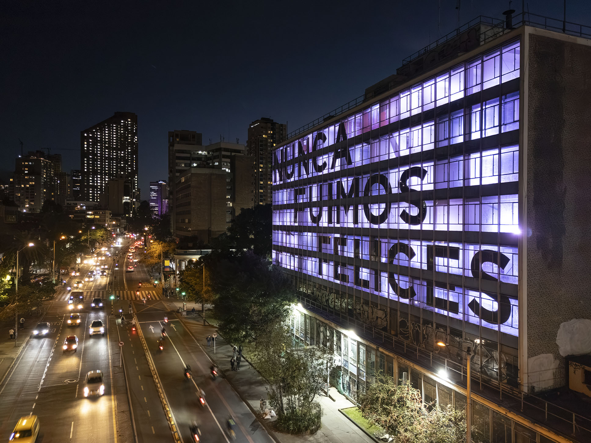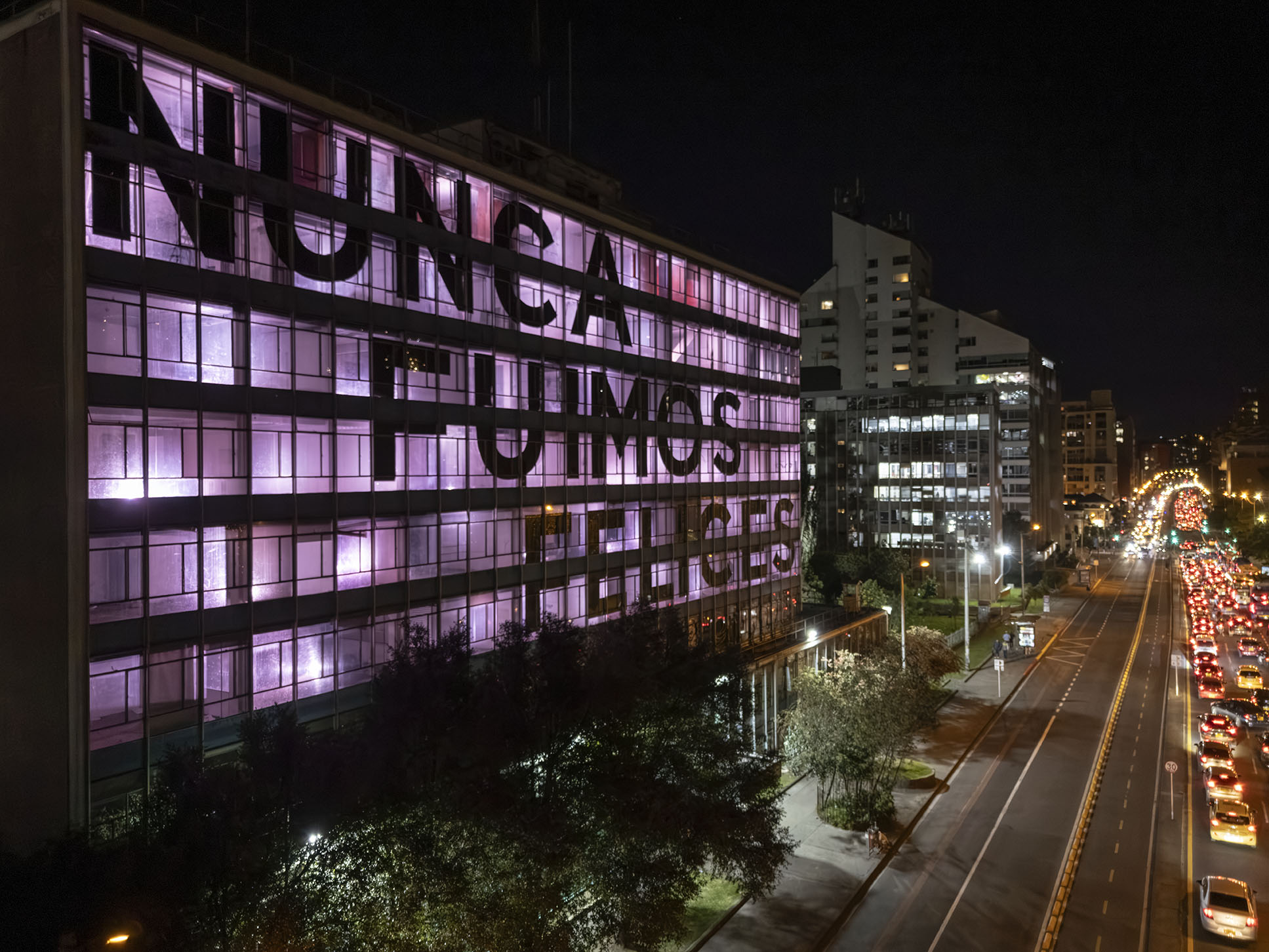 Esta instalación del artista peruano José Carlos Martinat, en colaboración con Taller Paralelo Arquitectos de Bogotá, retoma la icónica obra del artista chileno Alfredo Jaar, Estudios sobre la felicidad, quien a finales de los años setenta y comienzos de los ochenta formuló la pregunta “¿Es usted feliz?”, en varios espacios públicos en Santiago. Esta respuesta se plantea desde el icónico edificio de la CAR, sobre la carrera séptima, y que sigue siendo un símbolo de la arquitectura moderna bogotana. Hoy, es una especie de ícono mudo que mira hacia los cerros orientales, planteando esta errática yuxtaposición de sentimientos en los cuales se puede leer: "NUNCA FUIMOS FELICES", pero también, en algún momento: "FUIMOS FELICES", o simplemente: " NUNCA FUIMOS". Una pregunta que nos lleva a respuestas distintas, mientras el frenesí de la ciudad nos recuerda que vivir en Bogotá siempre será, irremediablemente, una promesa.