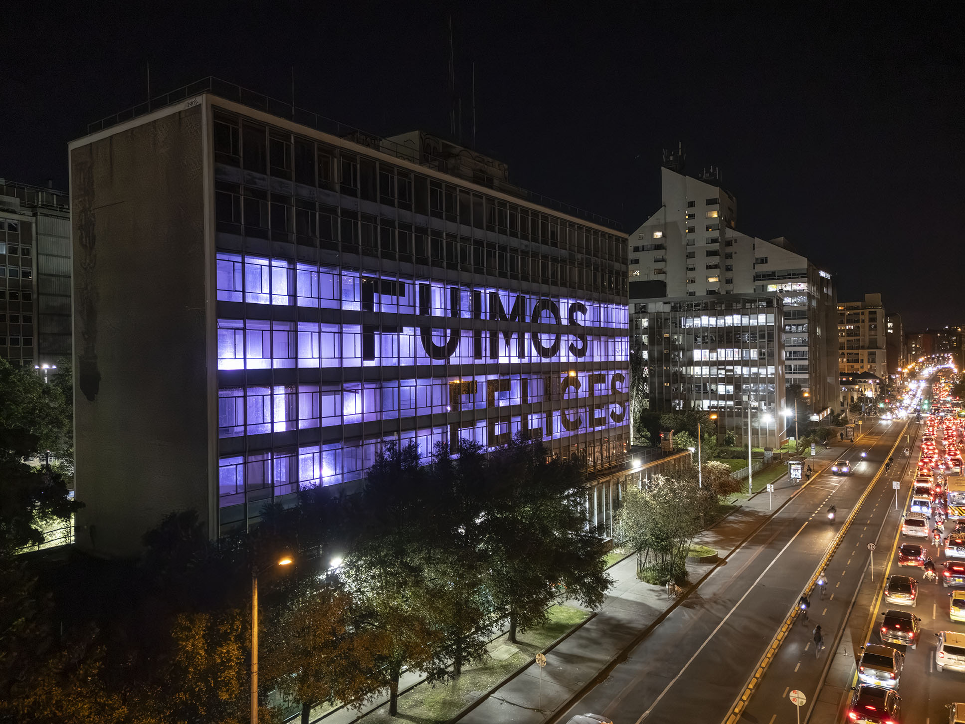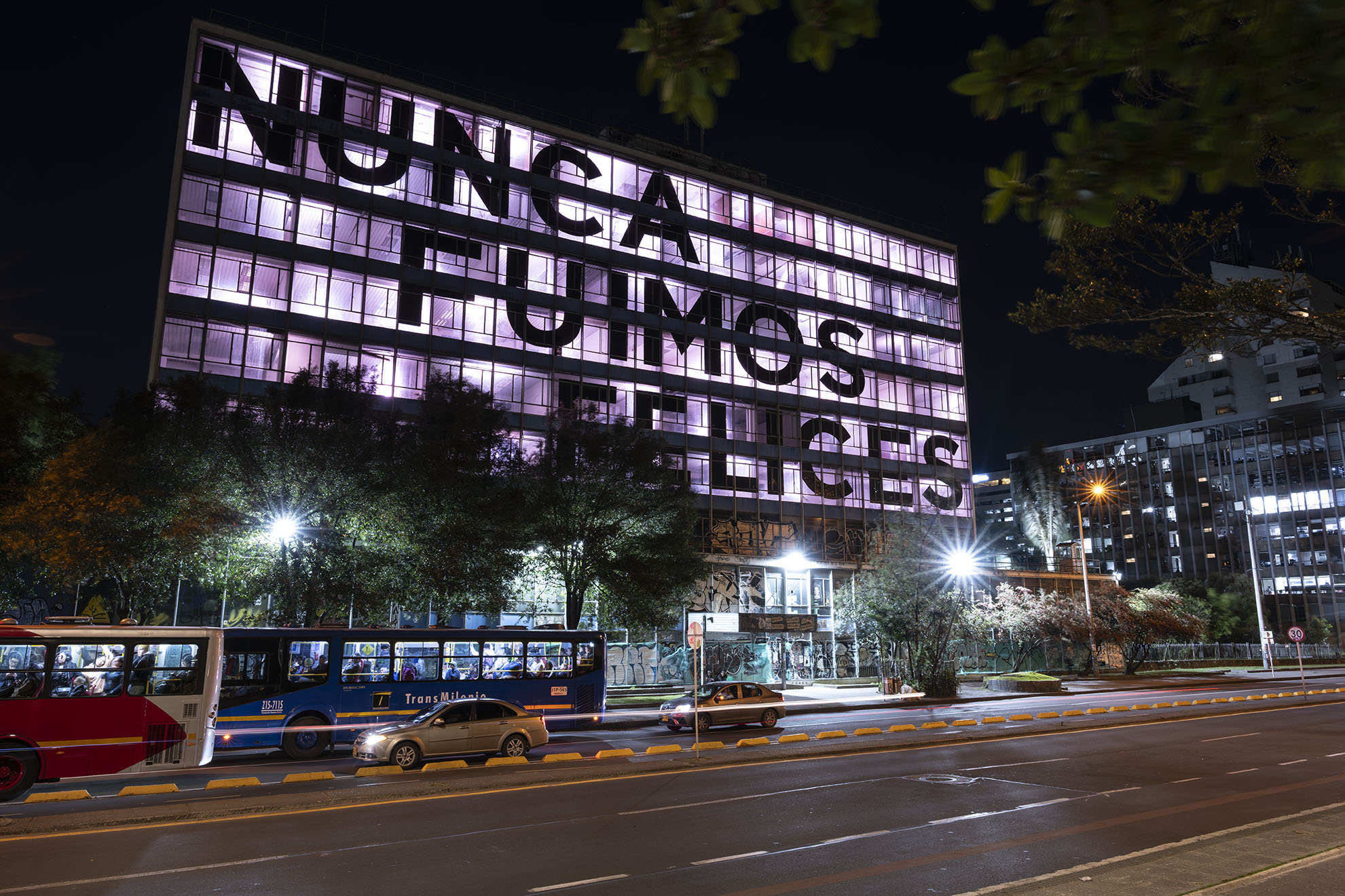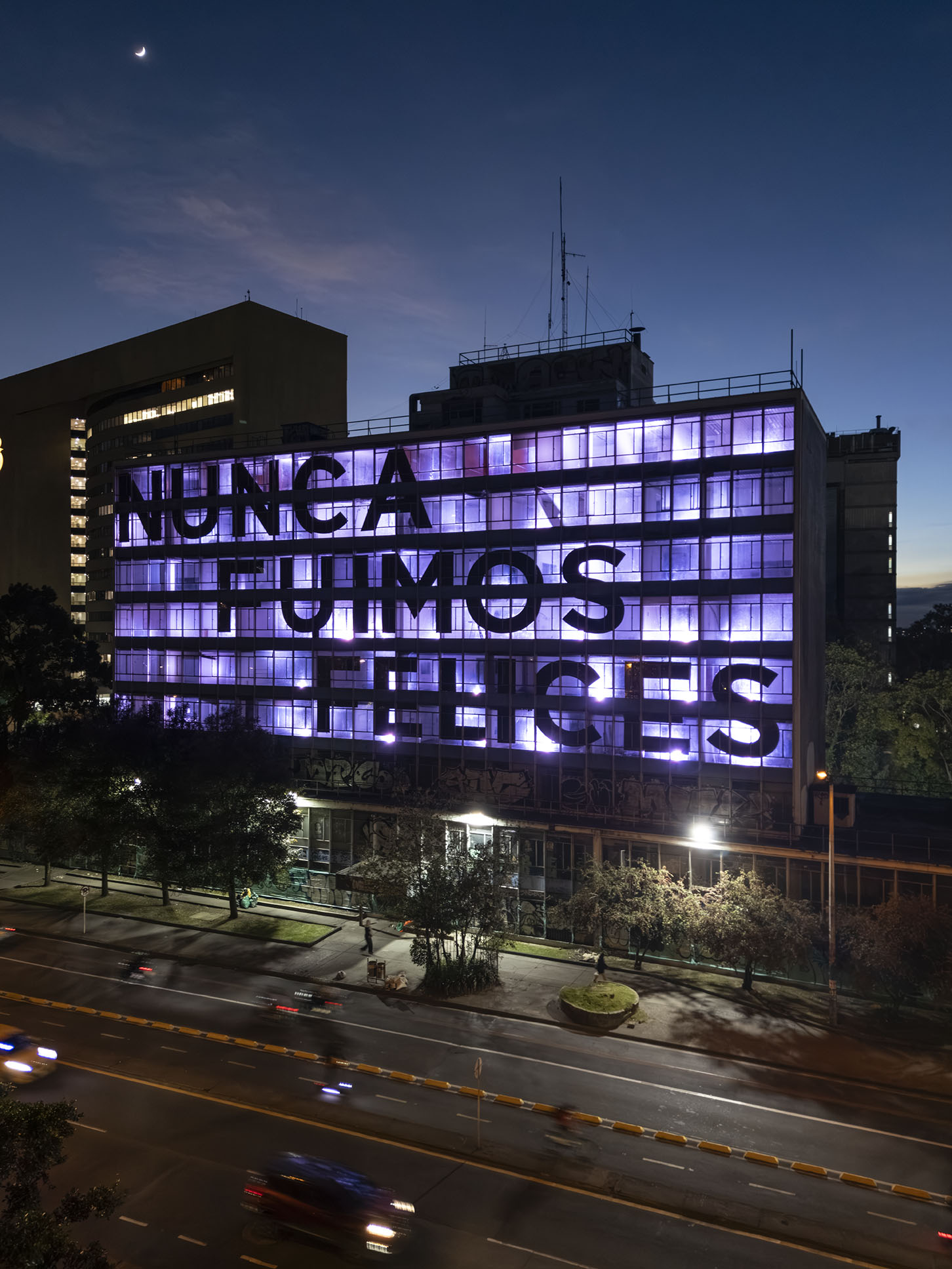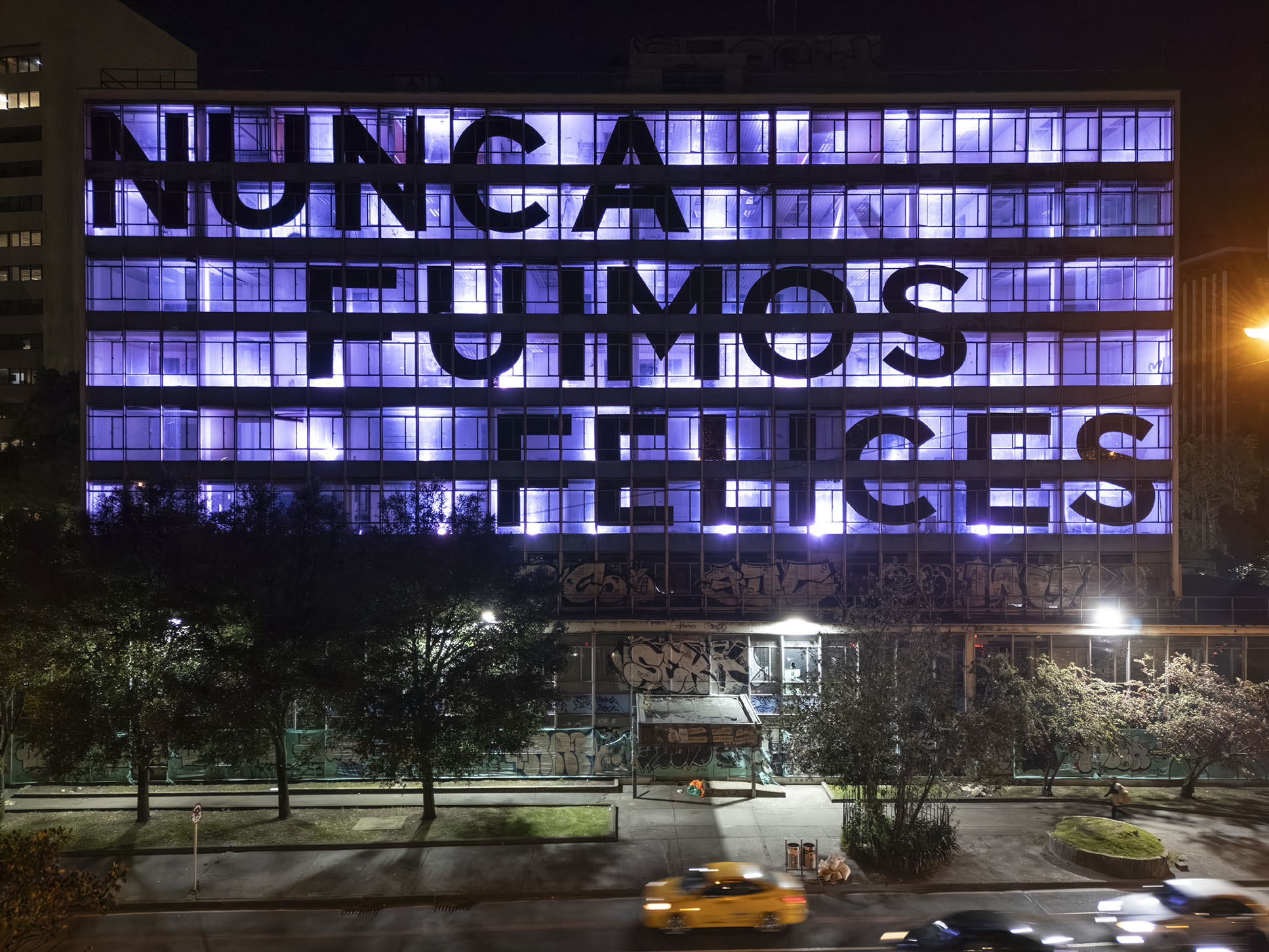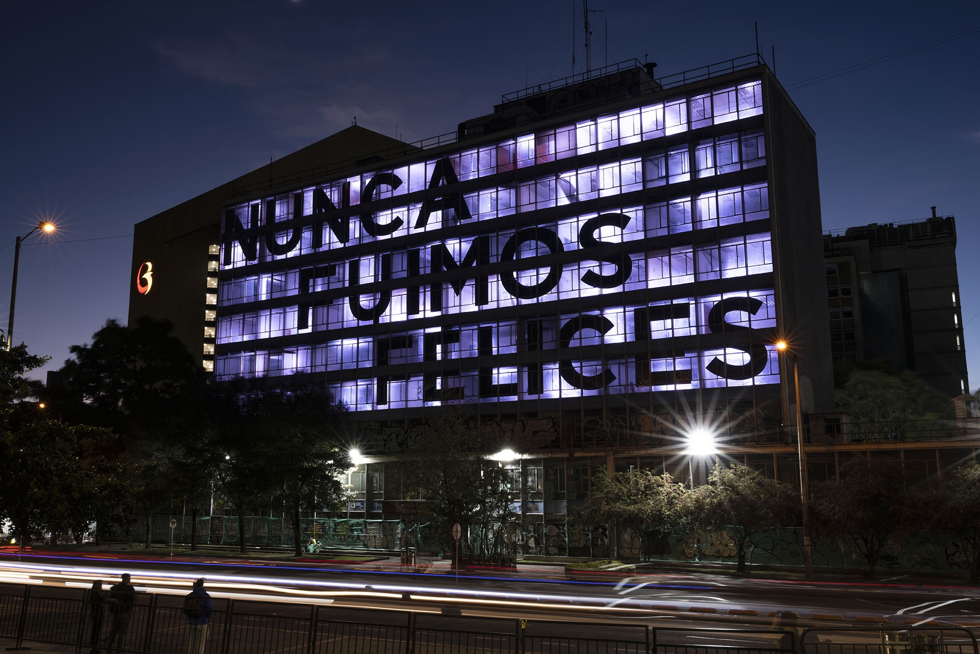 Esta instalación del artista peruano José Carlos Martinat, en colaboración con Taller Paralelo Arquitectos de Bogotá, retoma la icónica obra del artista chileno Alfredo Jaar, Estudios sobre la felicidad, quien a finales de los años setenta y comienzos de los ochenta formuló la pregunta “¿Es usted feliz?”, en varios espacios públicos en Santiago. Esta respuesta se plantea desde el icónico edificio de la CAR, sobre la carrera séptima, y que sigue siendo un símbolo de la arquitectura moderna bogotana. Hoy, es una especie de ícono mudo que mira hacia los cerros orientales, planteando esta errática yuxtaposición de sentimientos en los cuales se puede leer: "NUNCA FUIMOS FELICES", pero también, en algún momento: "FUIMOS FELICES", o simplemente: " NUNCA FUIMOS". Una pregunta que nos lleva a respuestas distintas, mientras el frenesí de la ciudad nos recuerda que vivir en Bogotá siempre será, irremediablemente, una promesa.