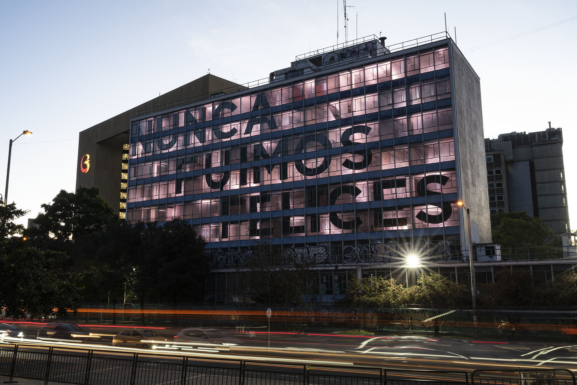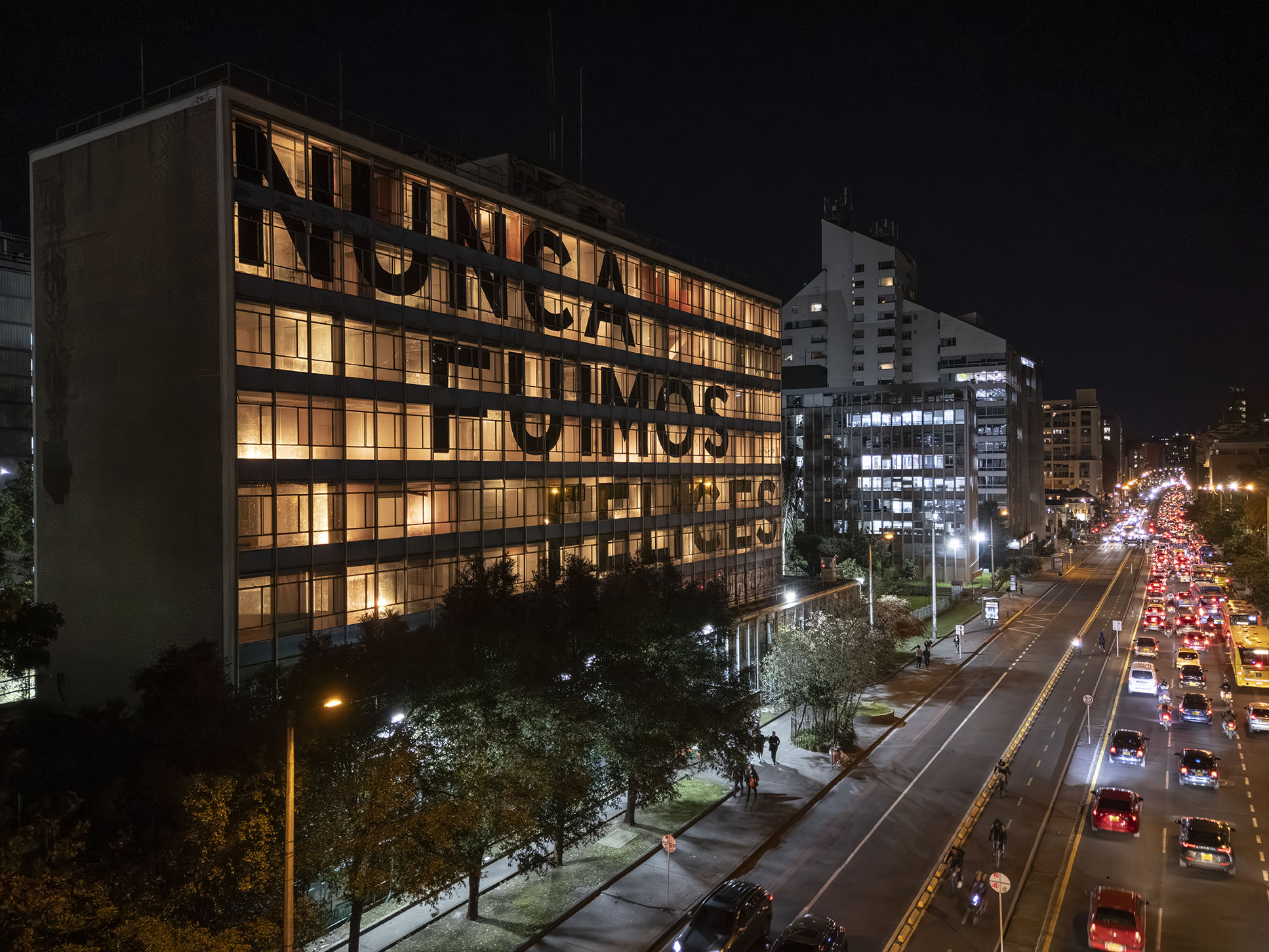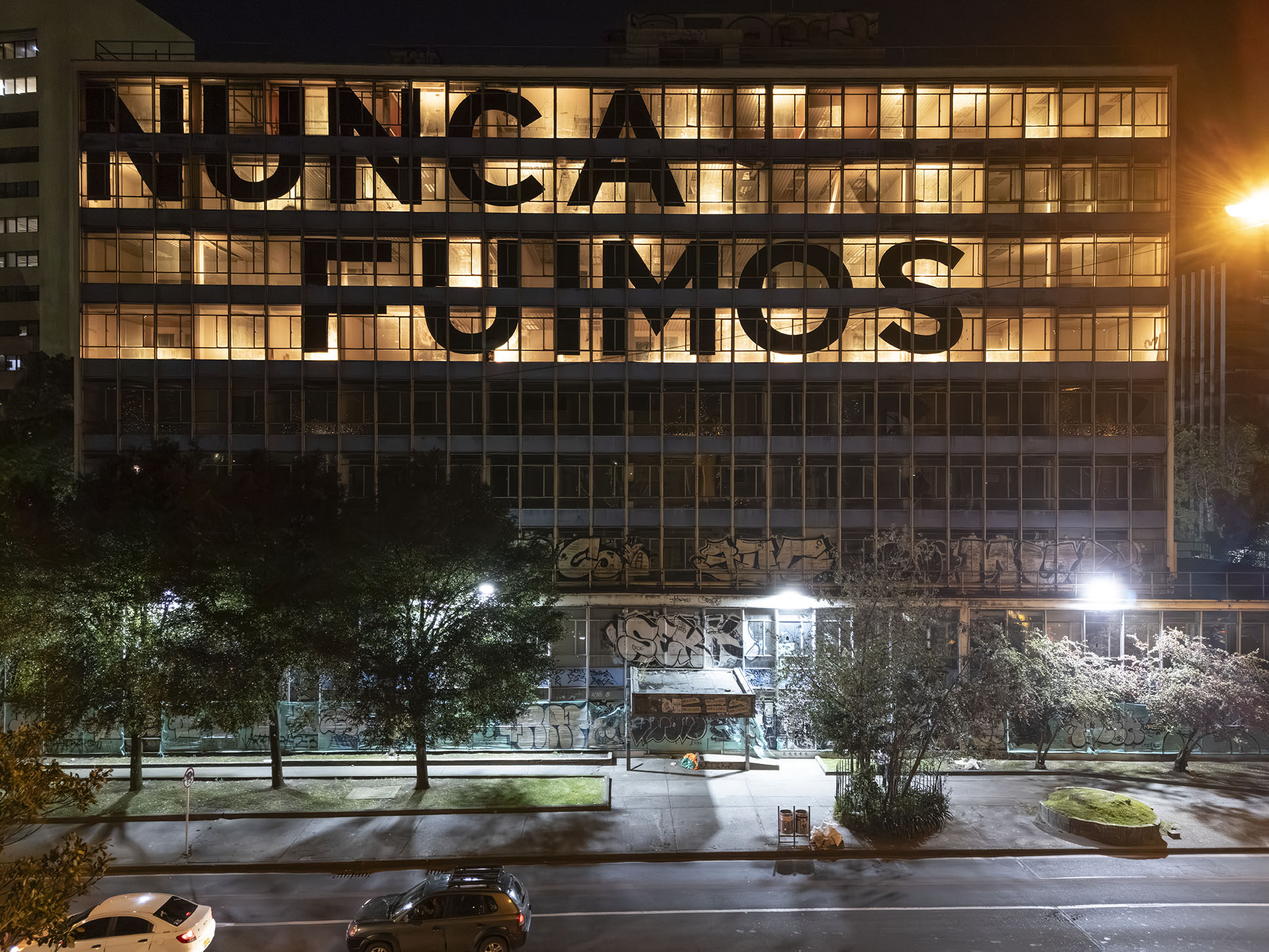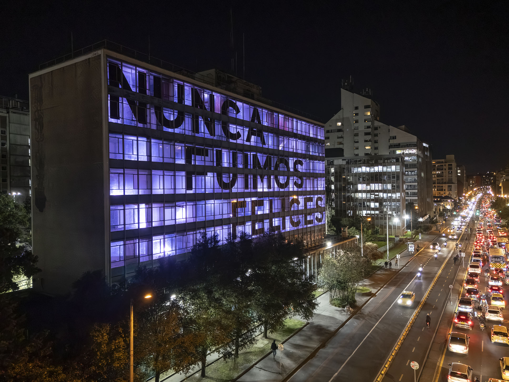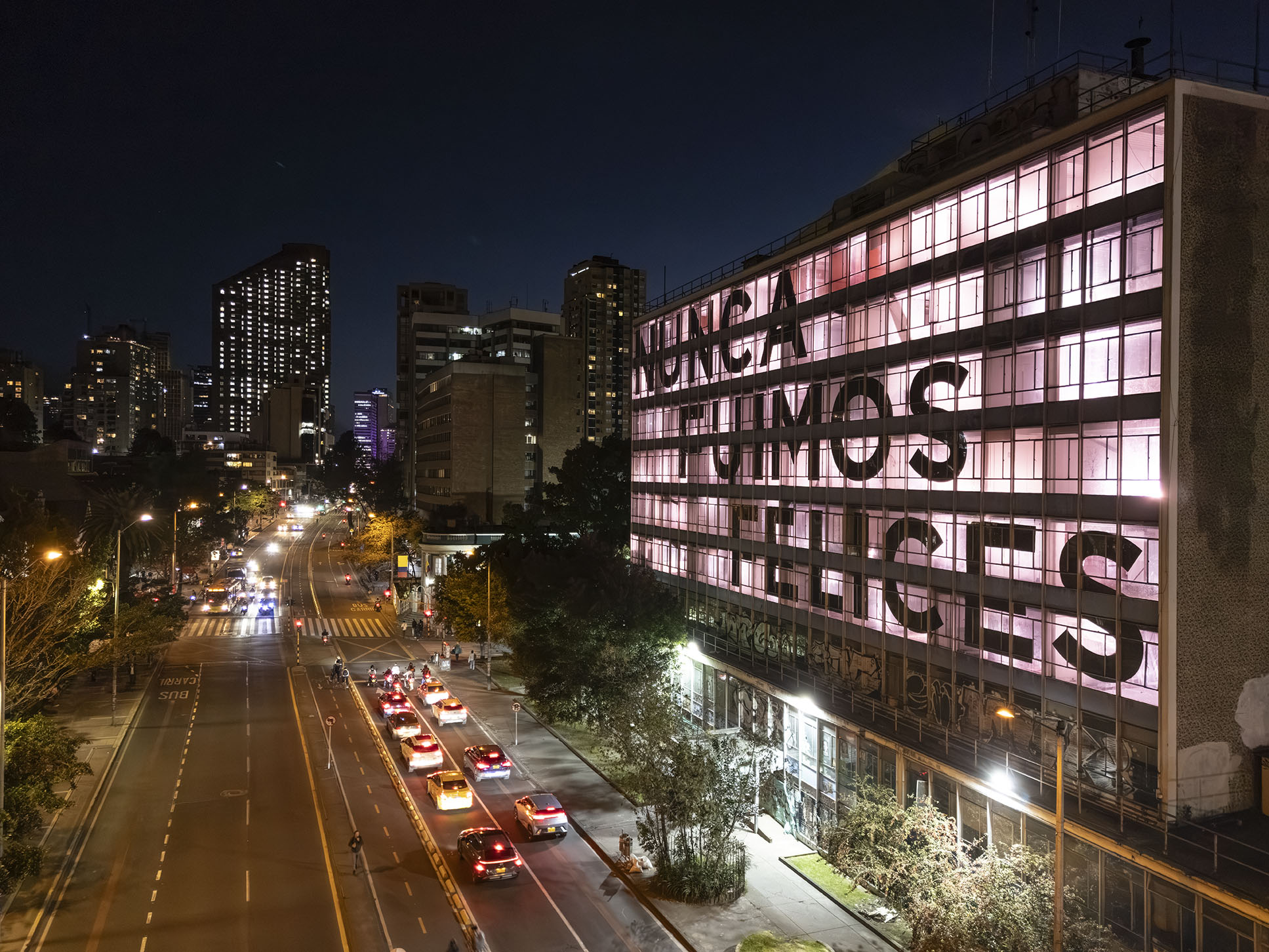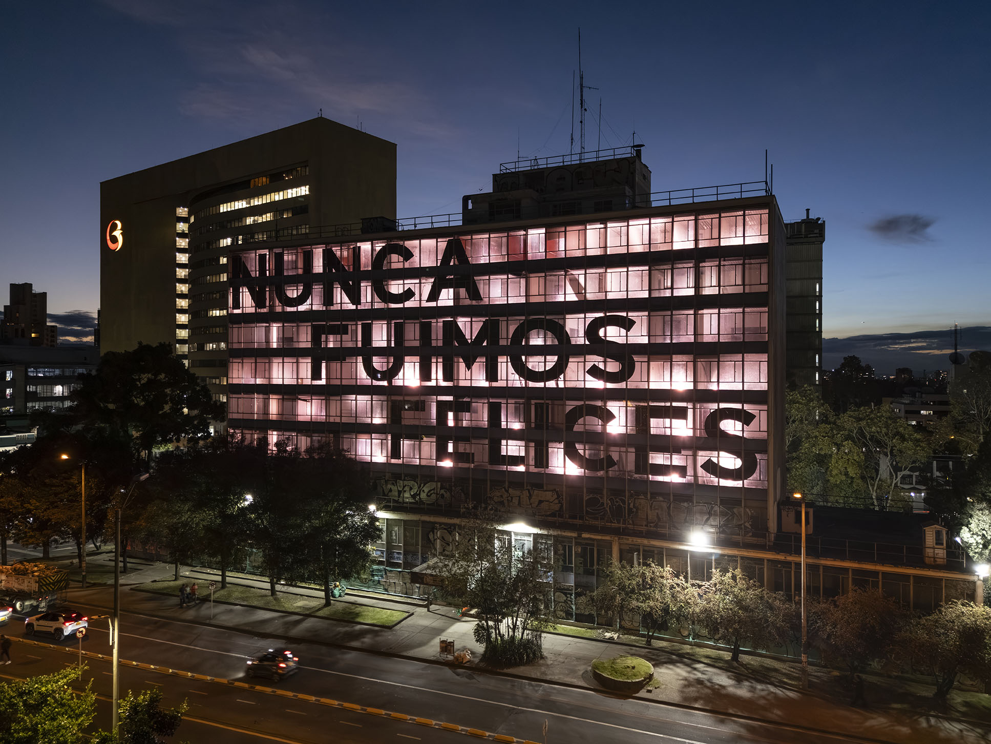 Esta instalación del artista peruano José Carlos Martinat, en colaboración con Taller Paralelo Arquitectos de Bogotá, retoma la icónica obra del artista chileno Alfredo Jaar, Estudios sobre la felicidad, quien a finales de los años setenta y comienzos de los ochenta formuló la pregunta “¿Es usted feliz?”, en varios espacios públicos en Santiago. Esta respuesta se plantea desde el icónico edificio de la CAR, sobre la carrera séptima, y que sigue siendo un símbolo de la arquitectura moderna bogotana. Hoy, es una especie de ícono mudo que mira hacia los cerros orientales, planteando esta errática yuxtaposición de sentimientos en los cuales se puede leer: "NUNCA FUIMOS FELICES", pero también, en algún momento: "FUIMOS FELICES", o simplemente: " NUNCA FUIMOS". Una pregunta que nos lleva a respuestas distintas, mientras el frenesí de la ciudad nos recuerda que vivir en Bogotá siempre será, irremediablemente, una promesa.