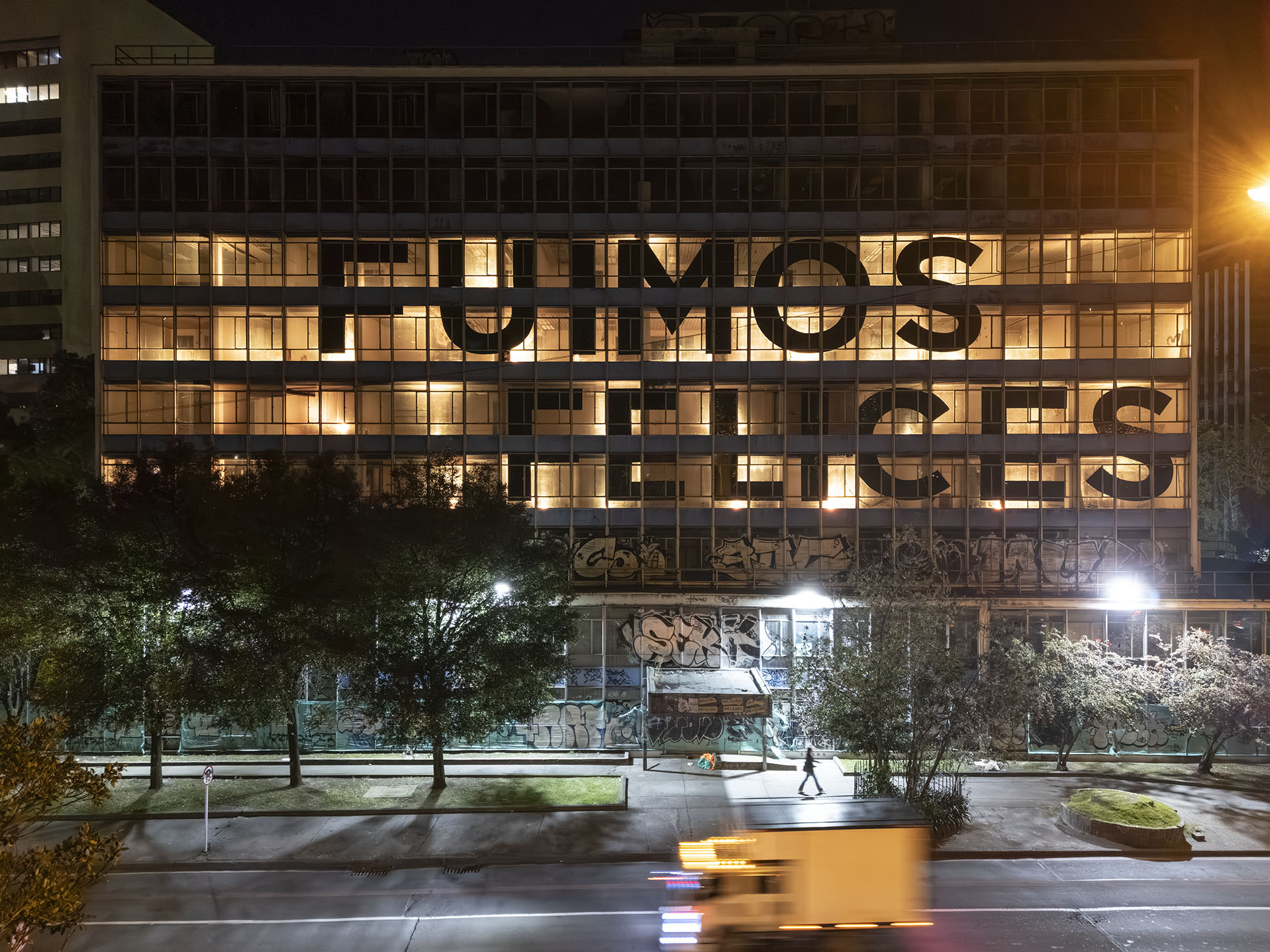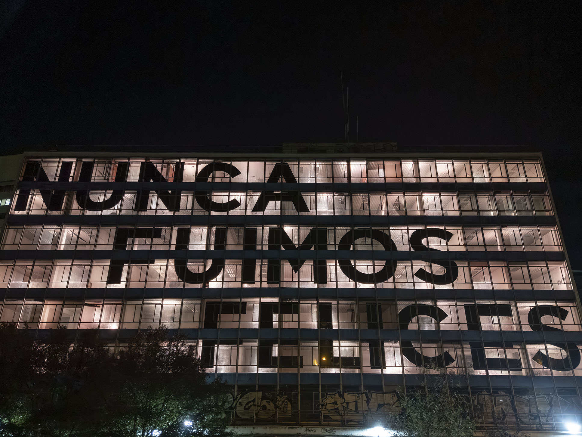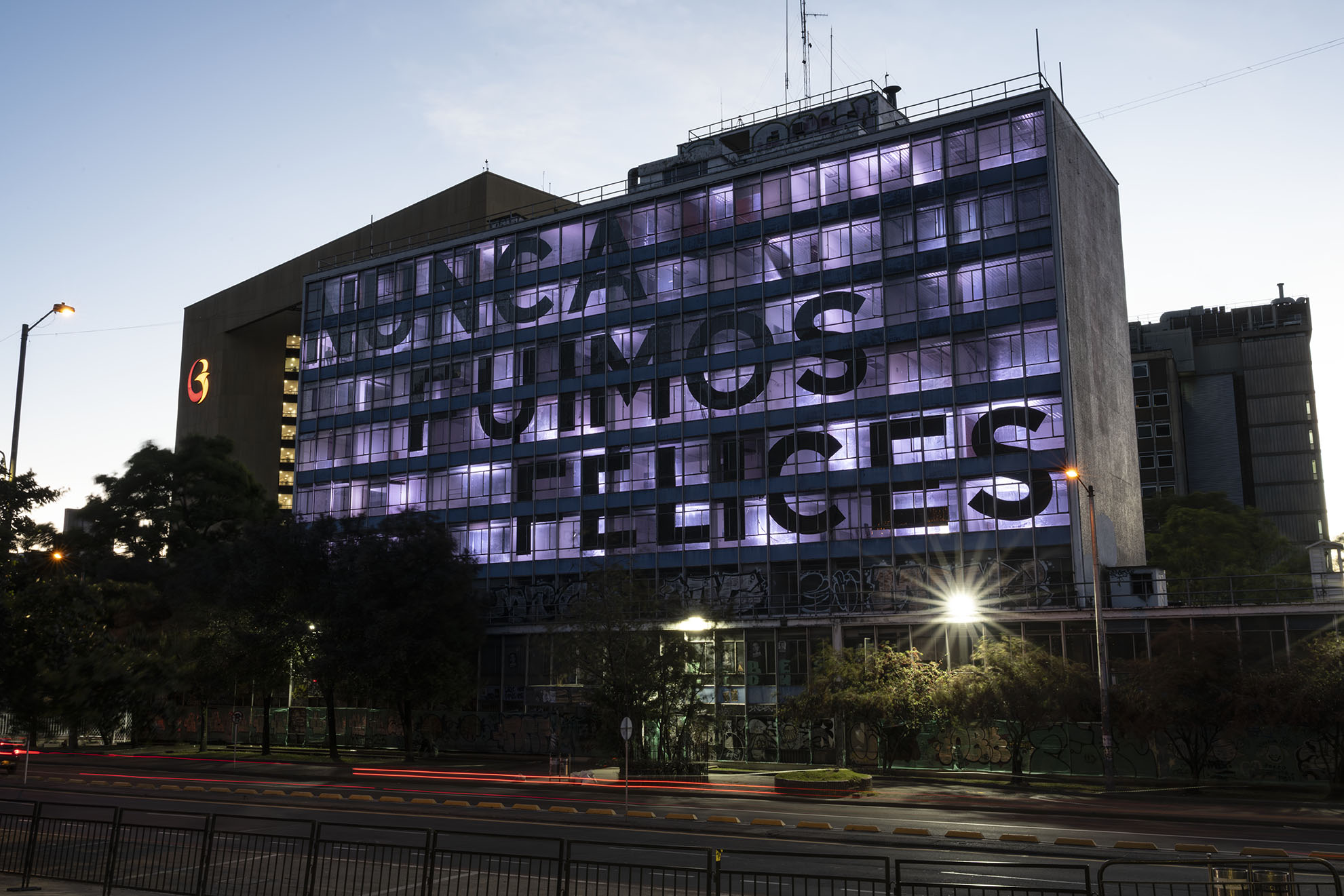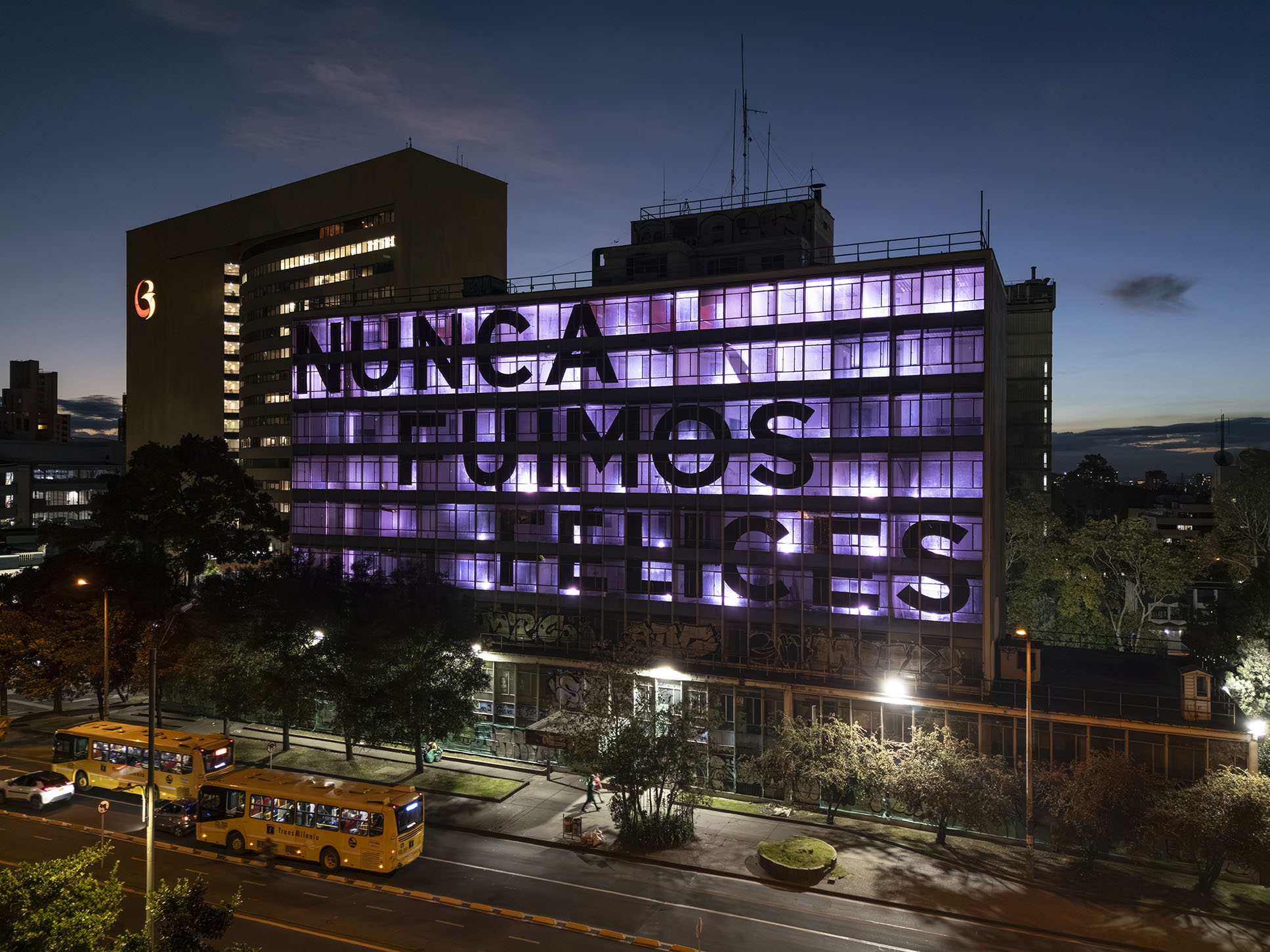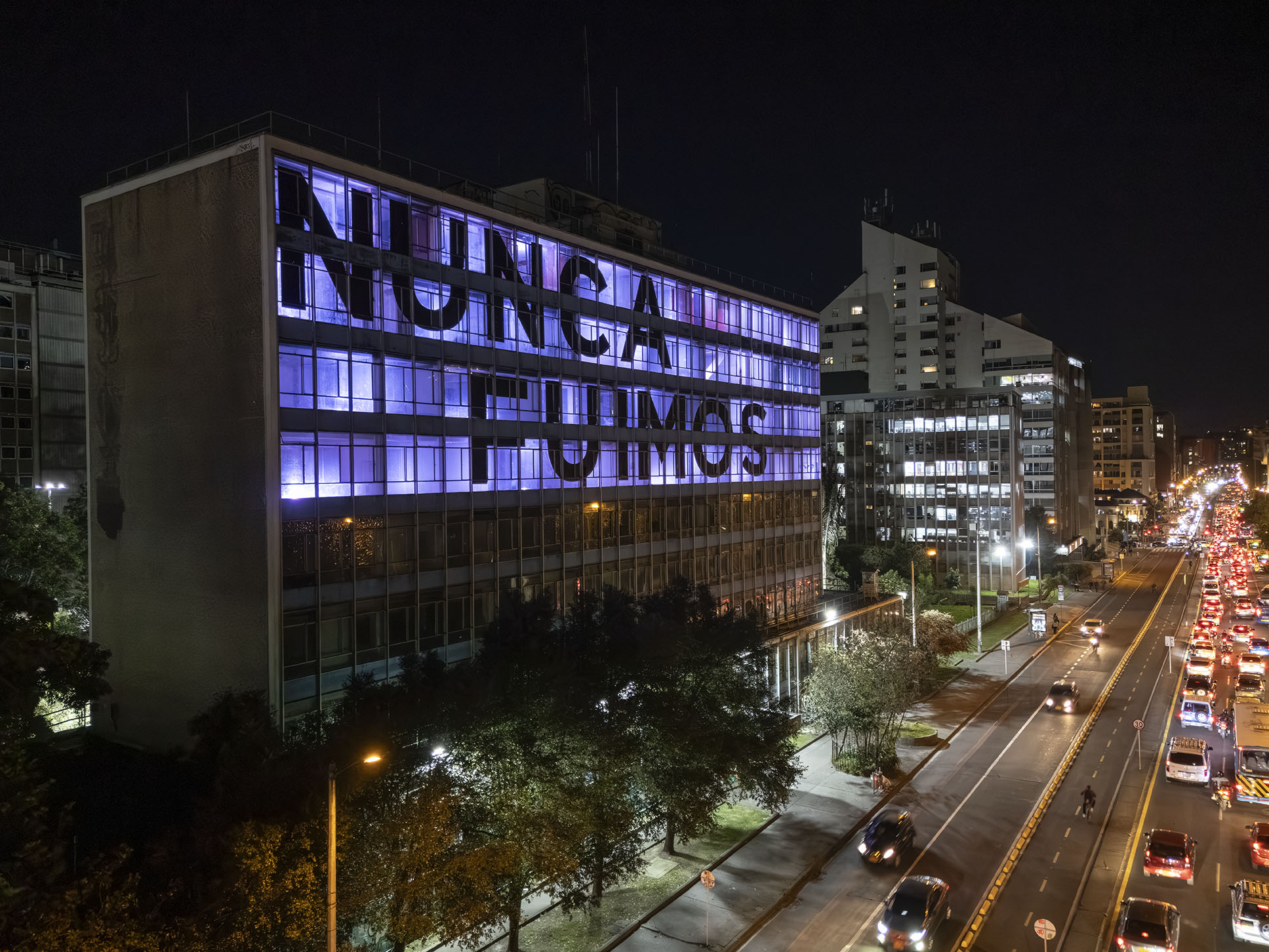 Esta instalación del artista peruano José Carlos Martinat, en colaboración con Taller Paralelo Arquitectos de Bogotá, retoma la icónica obra del artista chileno Alfredo Jaar, Estudios sobre la felicidad, quien a finales de los años setenta y comienzos de los ochenta formuló la pregunta “¿Es usted feliz?”, en varios espacios públicos en Santiago. Esta respuesta se plantea desde el icónico edificio de la CAR, sobre la carrera séptima, y que sigue siendo un símbolo de la arquitectura moderna bogotana. Hoy, es una especie de ícono mudo que mira hacia los cerros orientales, planteando esta errática yuxtaposición de sentimientos en los cuales se puede leer: "NUNCA FUIMOS FELICES", pero también, en algún momento: "FUIMOS FELICES", o simplemente: " NUNCA FUIMOS". Una pregunta que nos lleva a respuestas distintas, mientras el frenesí de la ciudad nos recuerda que vivir en Bogotá siempre será, irremediablemente, una promesa.