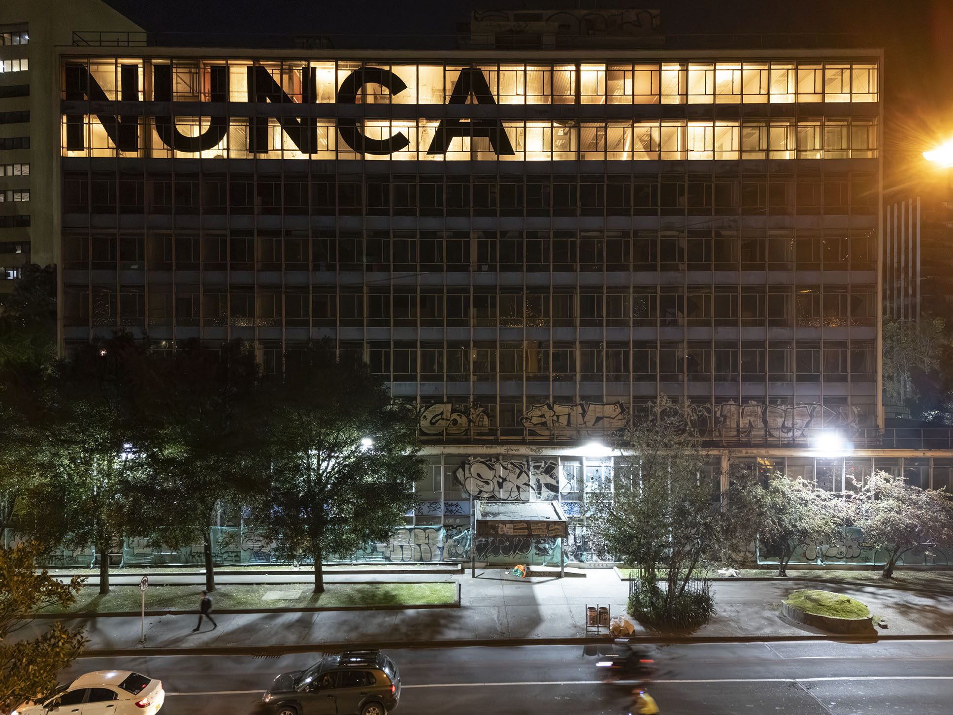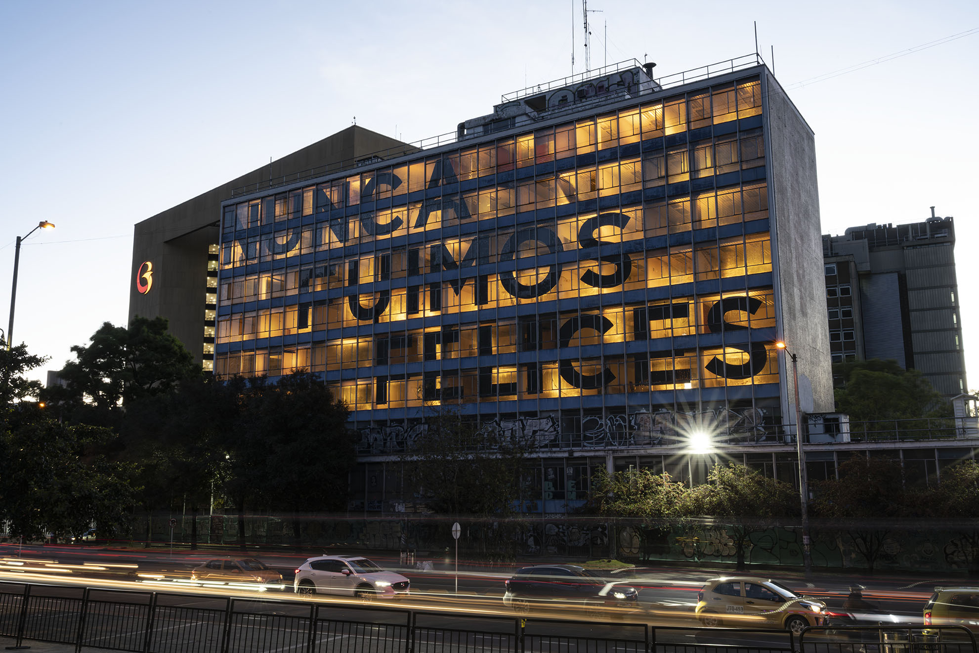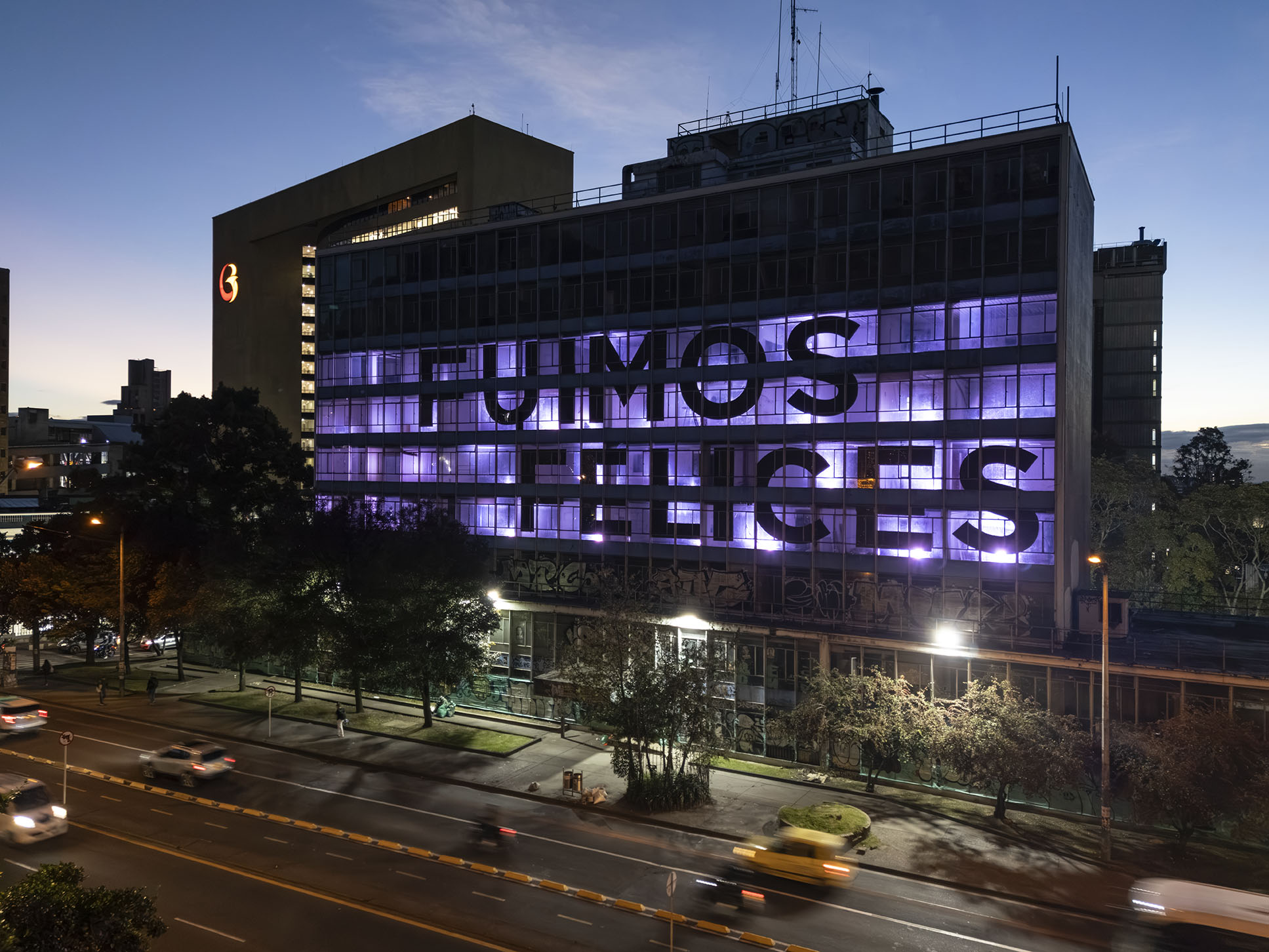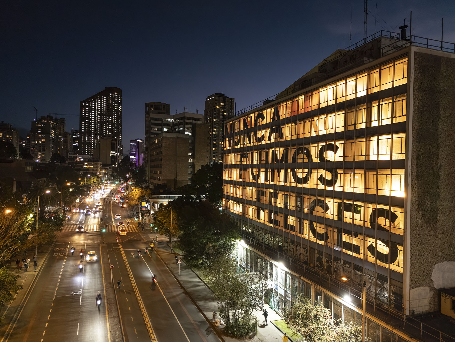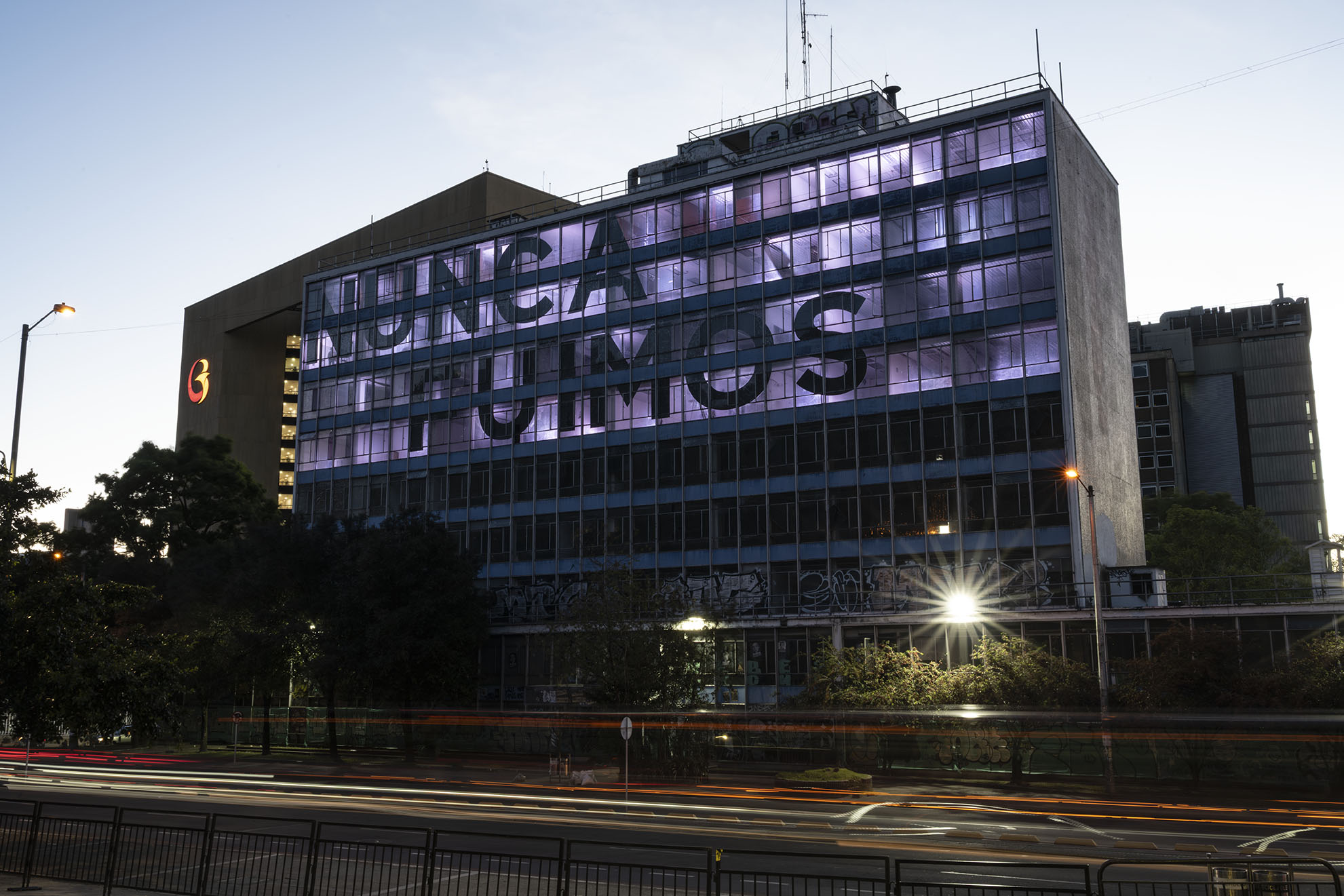 Esta instalación del artista peruano José Carlos Martinat, en colaboración con Taller Paralelo Arquitectos de Bogotá, retoma la icónica obra del artista chileno Alfredo Jaar, Estudios sobre la felicidad, quien a finales de los años setenta y comienzos de los ochenta formuló la pregunta “¿Es usted feliz?”, en varios espacios públicos en Santiago. Esta respuesta se plantea desde el icónico edificio de la CAR, sobre la carrera séptima, y que sigue siendo un símbolo de la arquitectura moderna bogotana. Hoy, es una especie de ícono mudo que mira hacia los cerros orientales, planteando esta errática yuxtaposición de sentimientos en los cuales se puede leer: "NUNCA FUIMOS FELICES", pero también, en algún momento: "FUIMOS FELICES", o simplemente: " NUNCA FUIMOS". Una pregunta que nos lleva a respuestas distintas, mientras el frenesí de la ciudad nos recuerda que vivir en Bogotá siempre será, irremediablemente, una promesa.