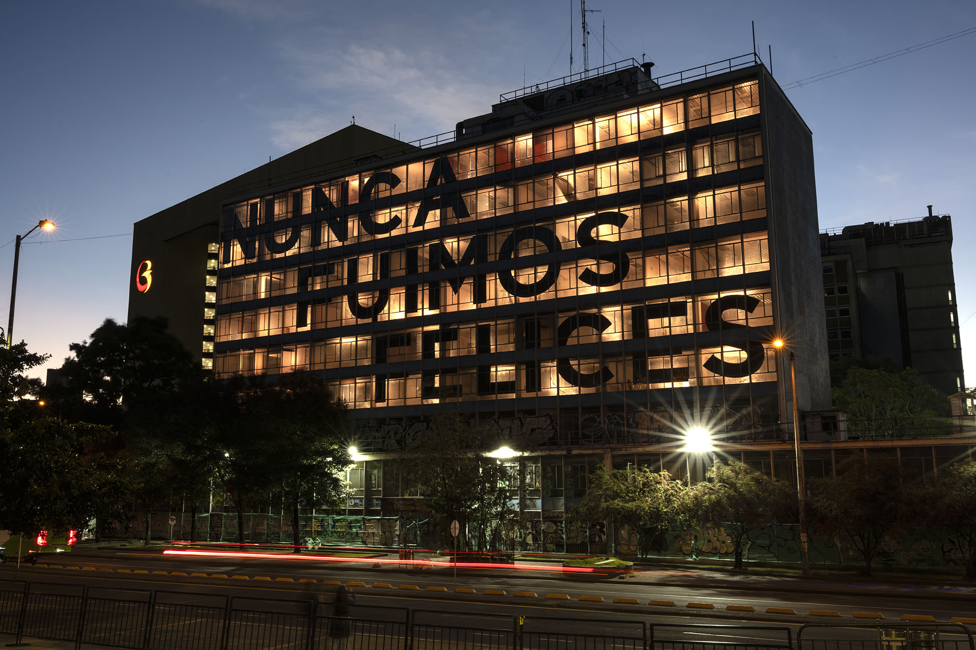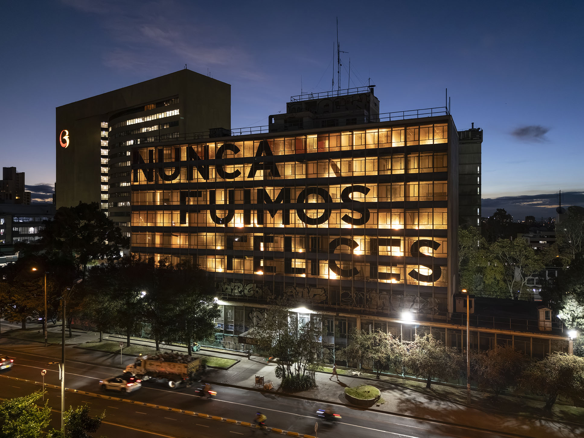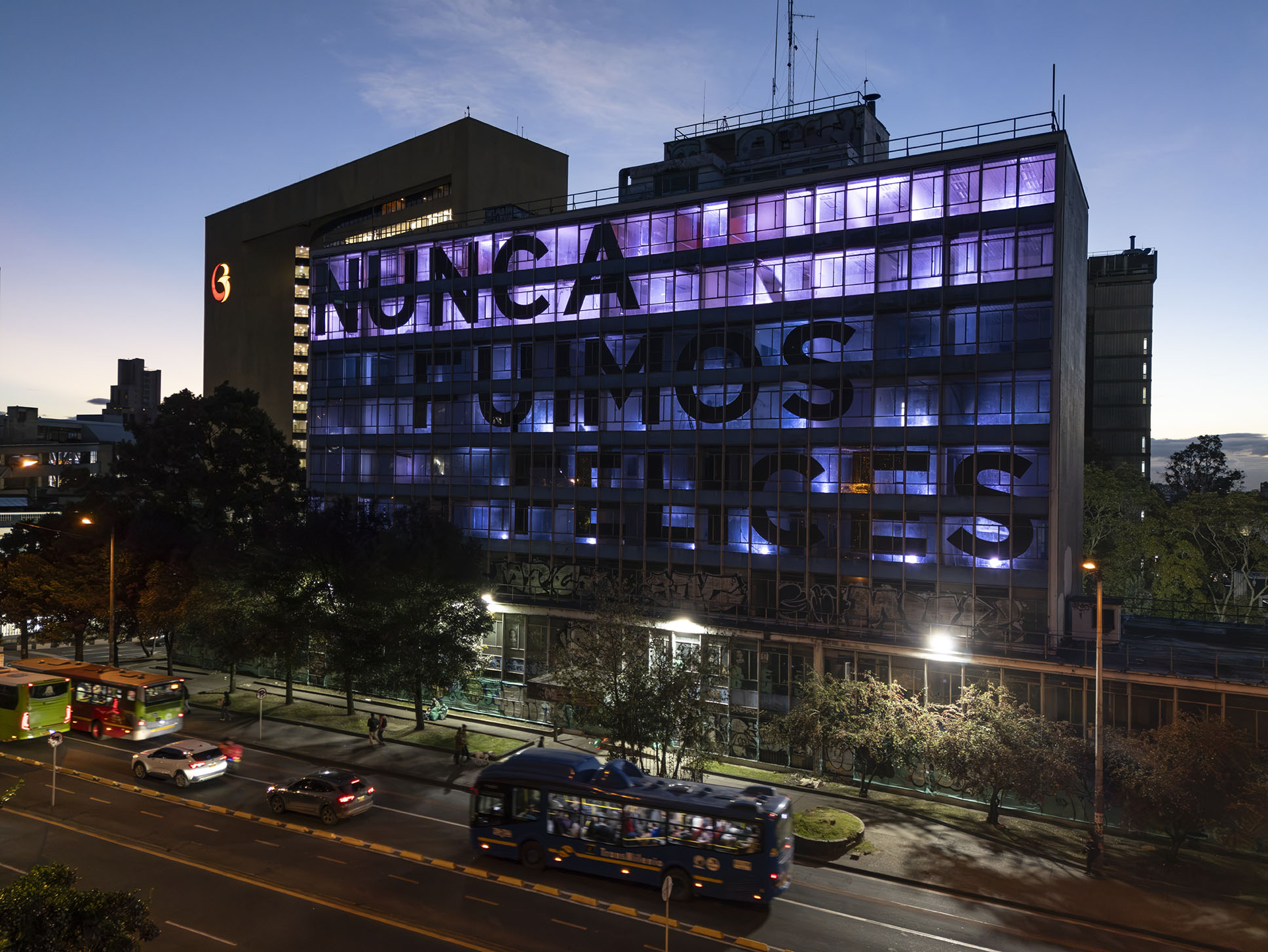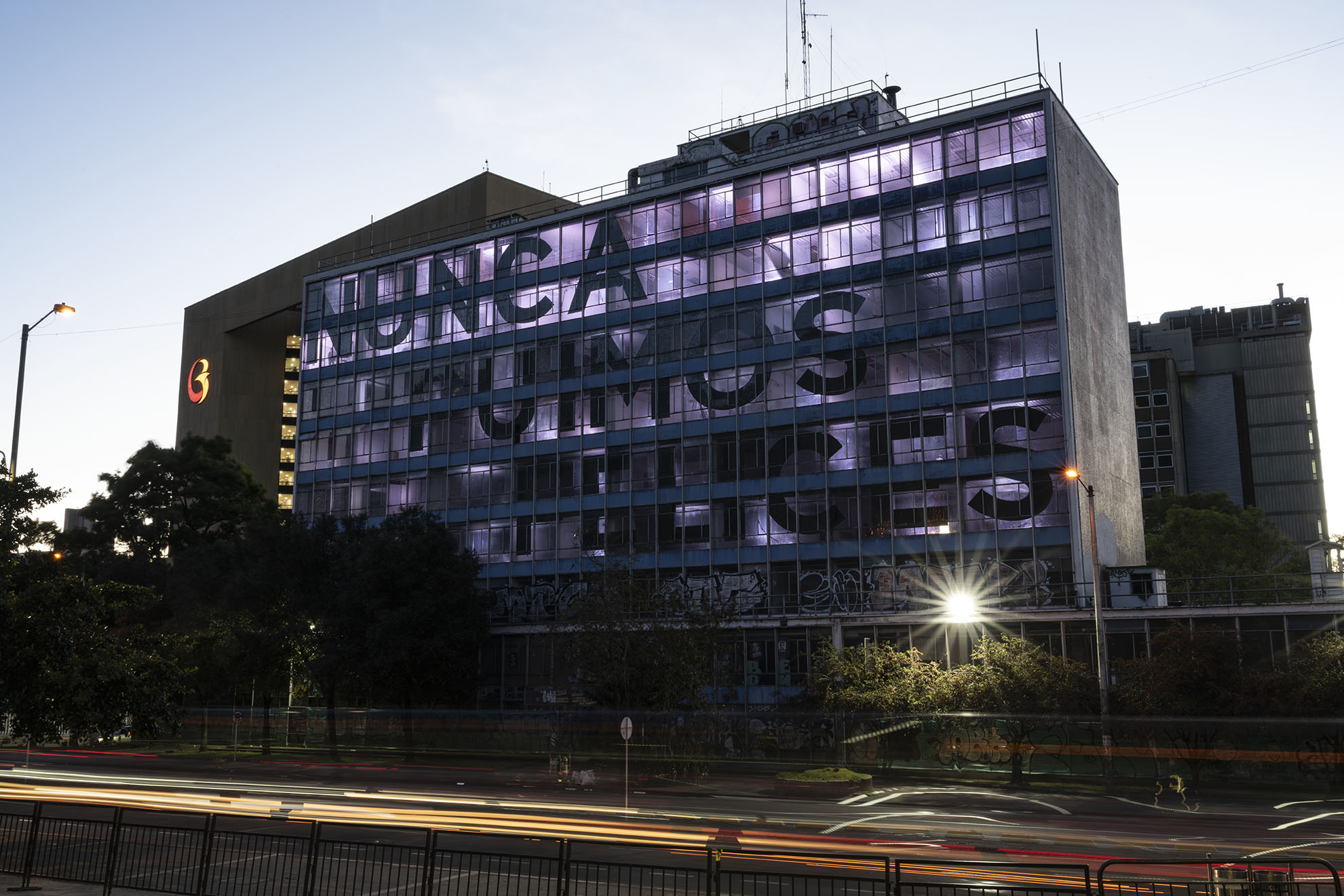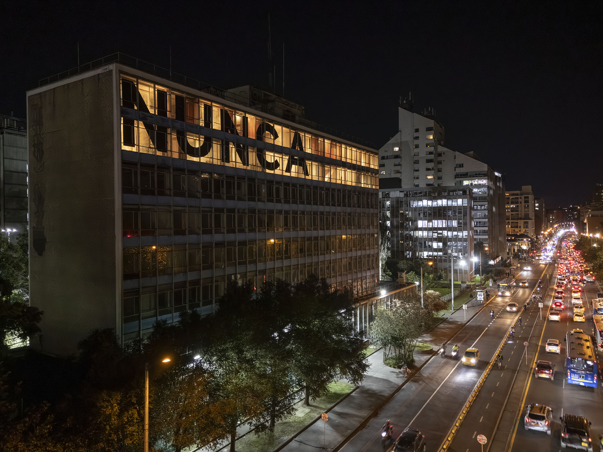Esta instalación del artista peruano José Carlos Martinat, en colaboración con Taller Paralelo Arquitectos de Bogotá, retoma la icónica obra del artista chileno Alfredo Jaar, Estudios sobre la felicidad, quien a finales de los años setenta y comienzos de los ochenta formuló la pregunta “¿Es usted feliz?”, en varios espacios públicos en Santiago. Esta respuesta se plantea desde el icónico edificio de la CAR, sobre la carrera séptima, y que sigue siendo un símbolo de la arquitectura moderna bogotana. Hoy, es una especie de ícono mudo que mira hacia los cerros orientales, planteando esta errática yuxtaposición de sentimientos en los cuales se puede leer: "NUNCA FUIMOS FELICES", pero también, en algún momento: "FUIMOS FELICES", o simplemente: " NUNCA FUIMOS". Una pregunta que nos lleva a respuestas distintas, mientras el frenesí de la ciudad nos recuerda que vivir en Bogotá siempre será, irremediablemente, una promesa.