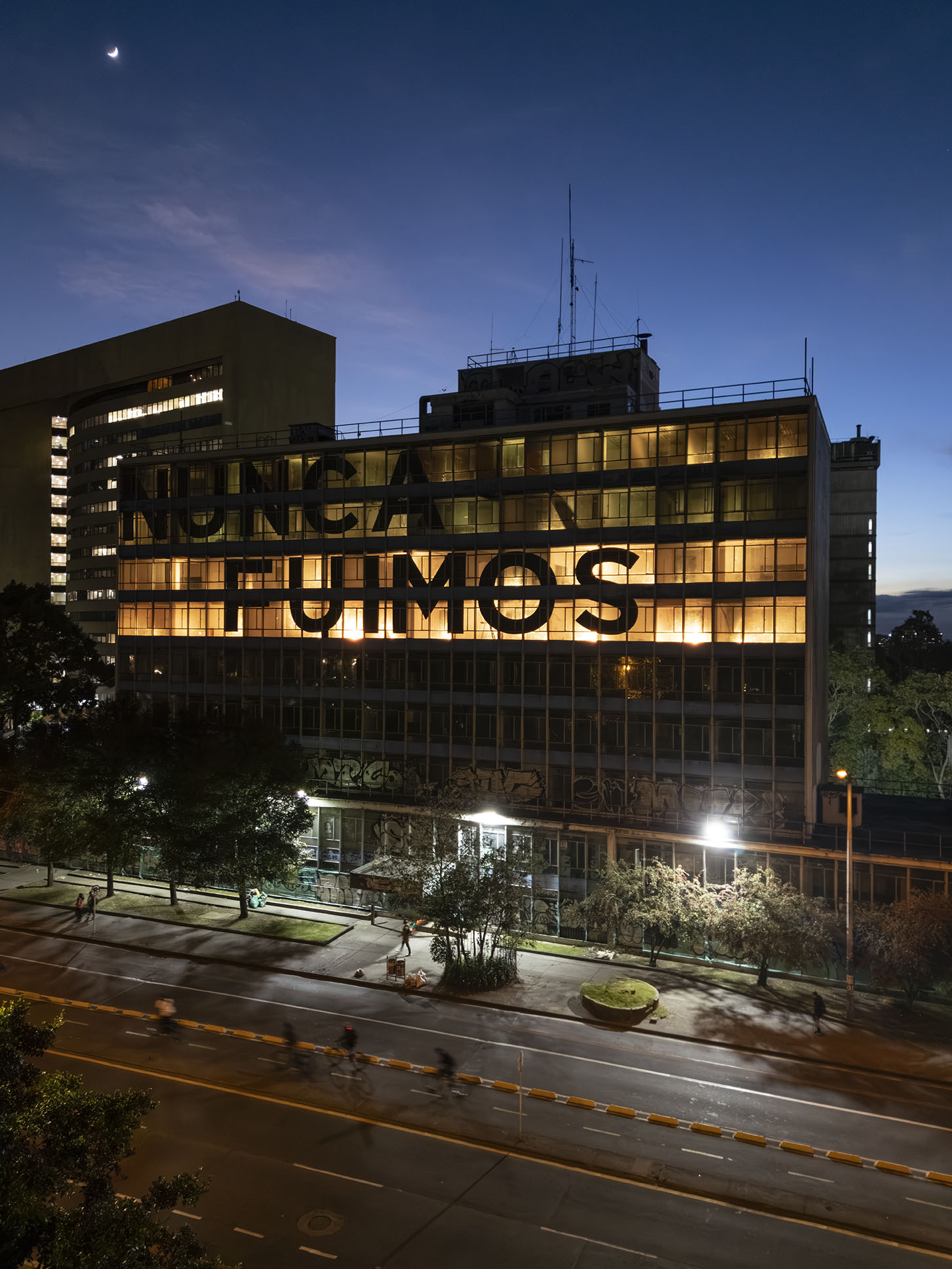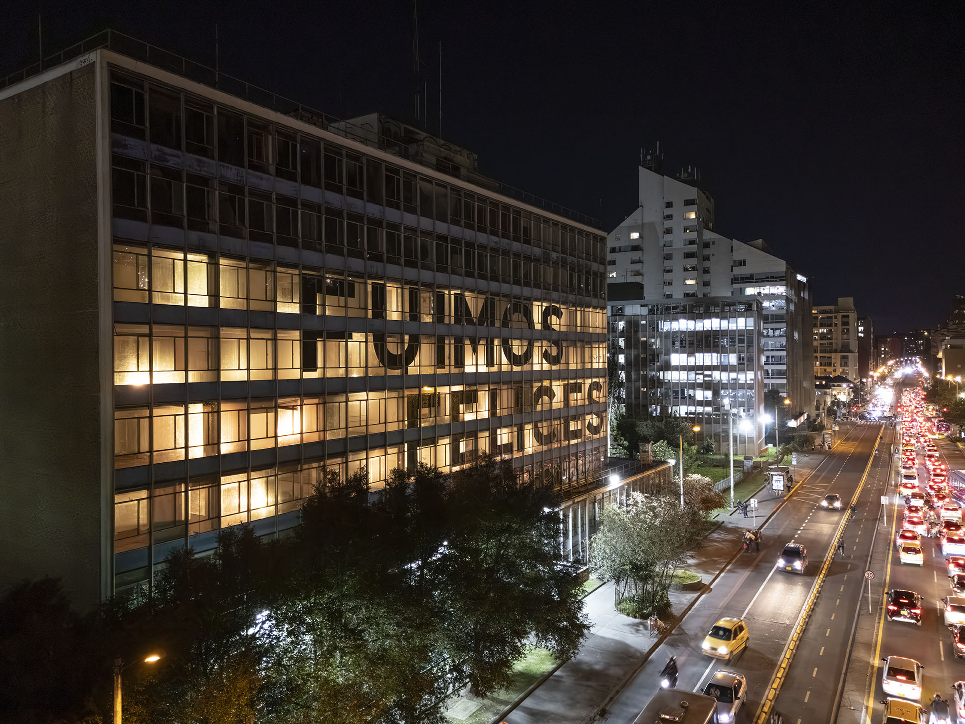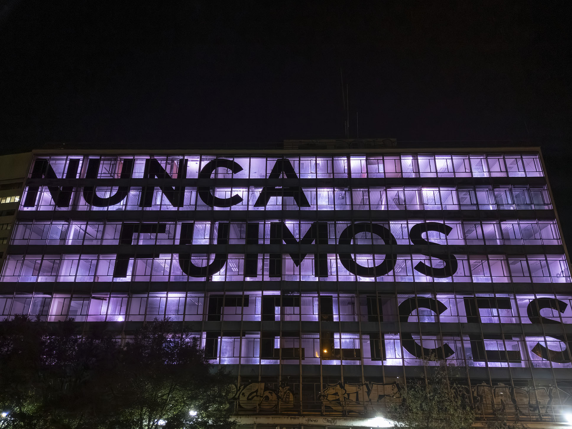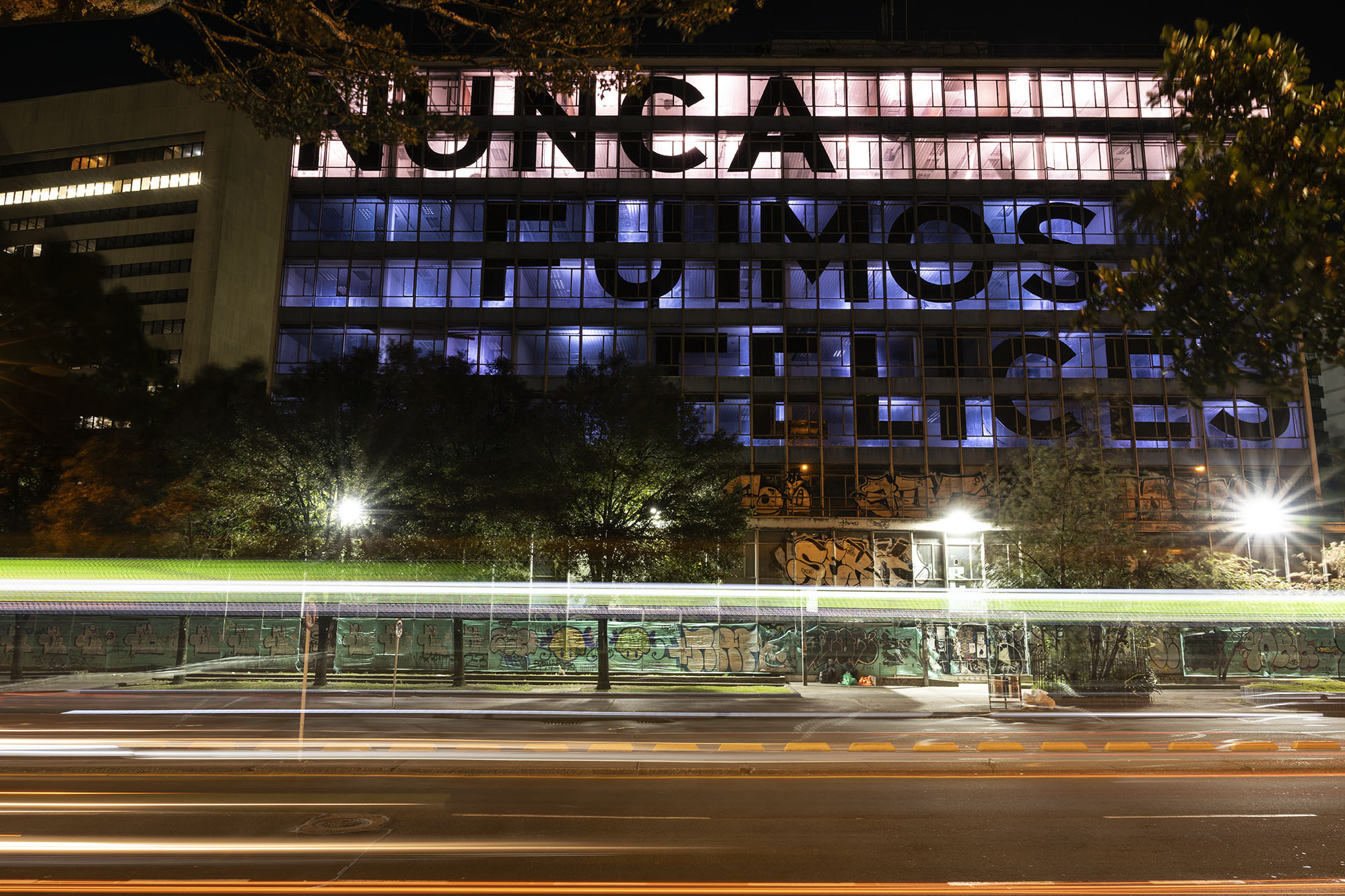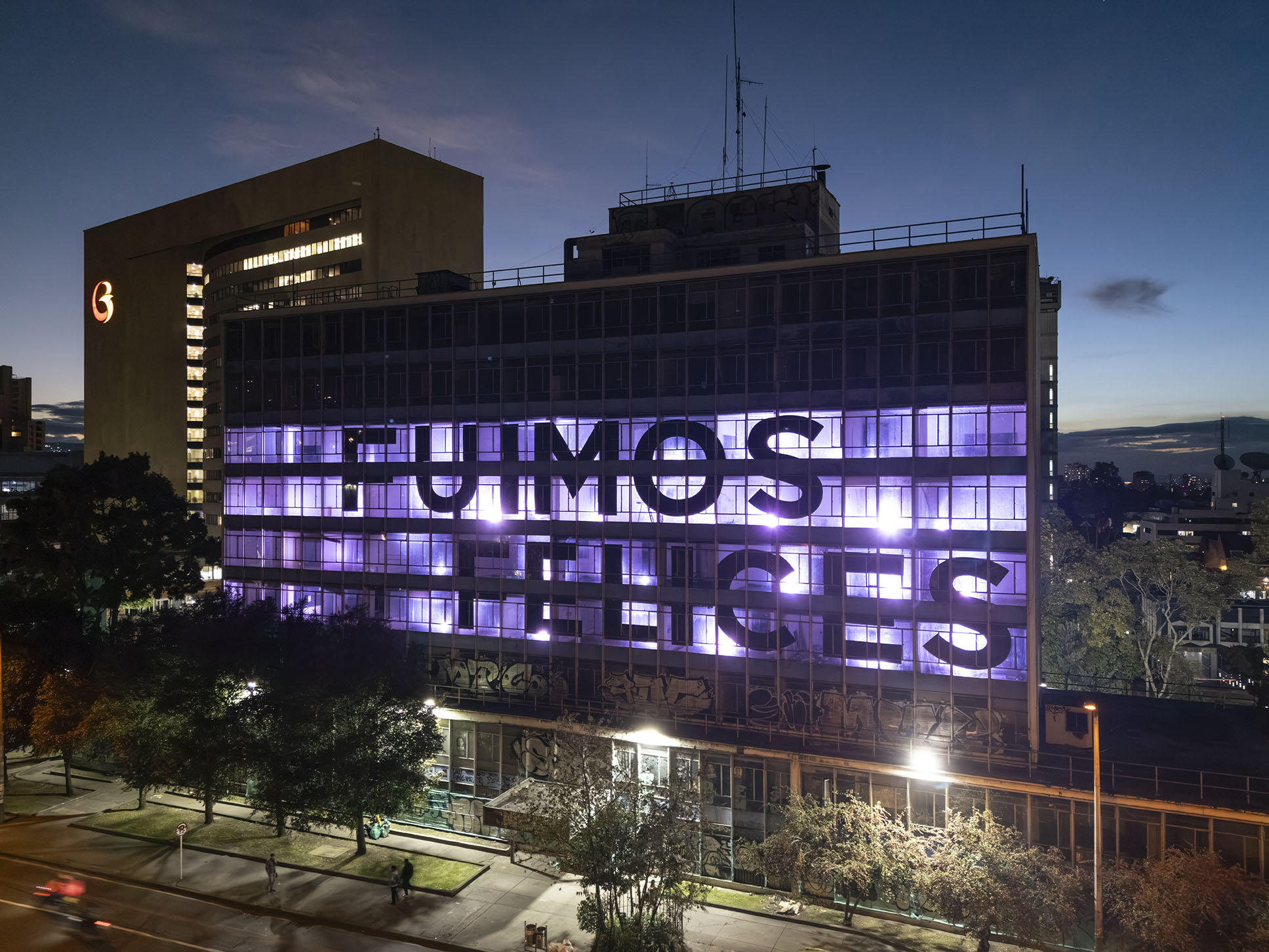 Esta instalación del artista peruano José Carlos Martinat, en colaboración con Taller Paralelo Arquitectos de Bogotá, retoma la icónica obra del artista chileno Alfredo Jaar, Estudios sobre la felicidad, quien a finales de los años setenta y comienzos de los ochenta formuló la pregunta “¿Es usted feliz?”, en varios espacios públicos en Santiago. Esta respuesta se plantea desde el icónico edificio de la CAR, sobre la carrera séptima, y que sigue siendo un símbolo de la arquitectura moderna bogotana. Hoy, es una especie de ícono mudo que mira hacia los cerros orientales, planteando esta errática yuxtaposición de sentimientos en los cuales se puede leer: "NUNCA FUIMOS FELICES", pero también, en algún momento: "FUIMOS FELICES", o simplemente: " NUNCA FUIMOS". Una pregunta que nos lleva a respuestas distintas, mientras el frenesí de la ciudad nos recuerda que vivir en Bogotá siempre será, irremediablemente, una promesa.