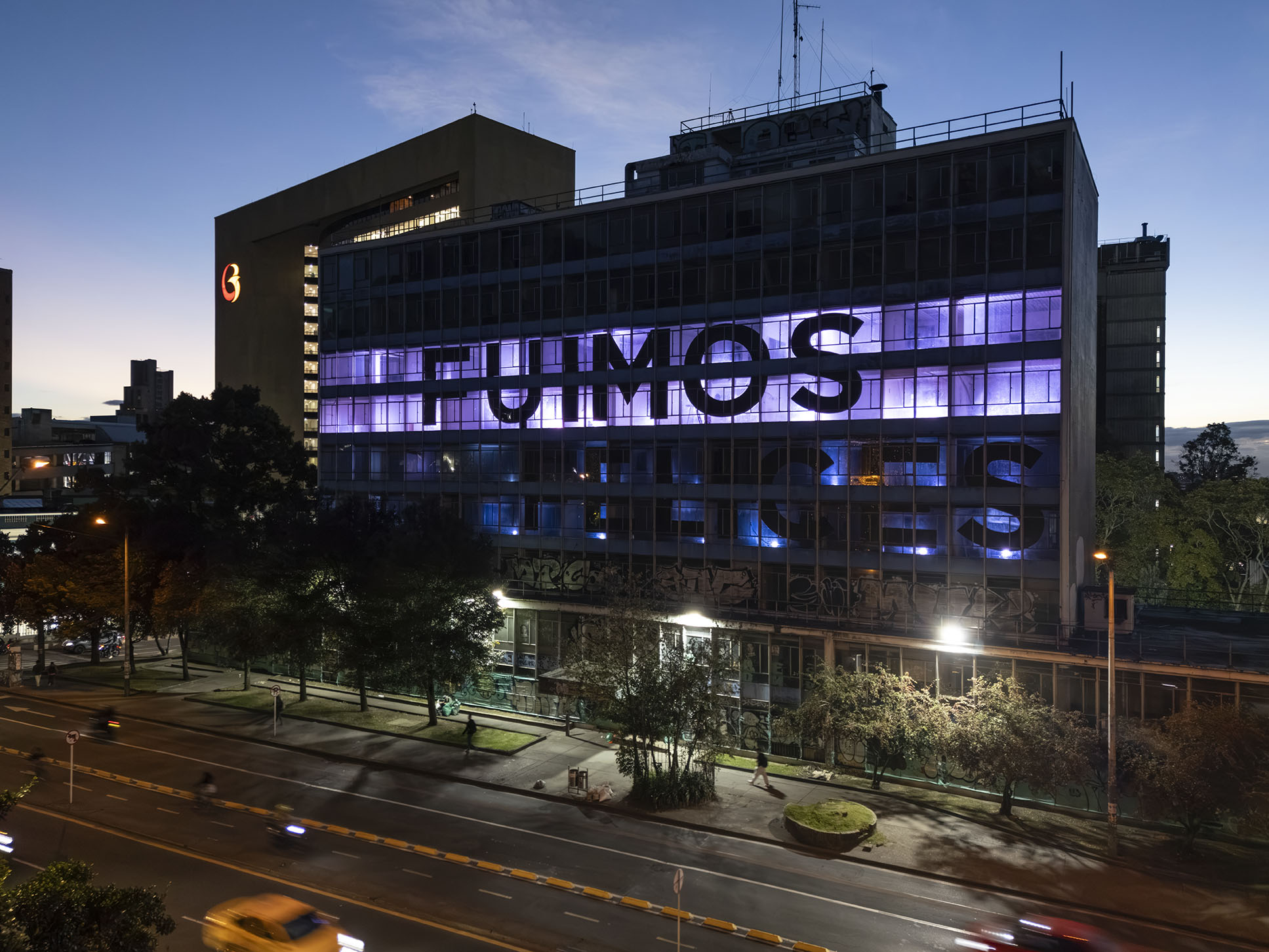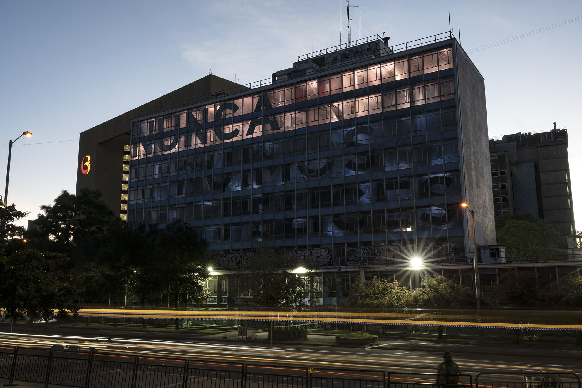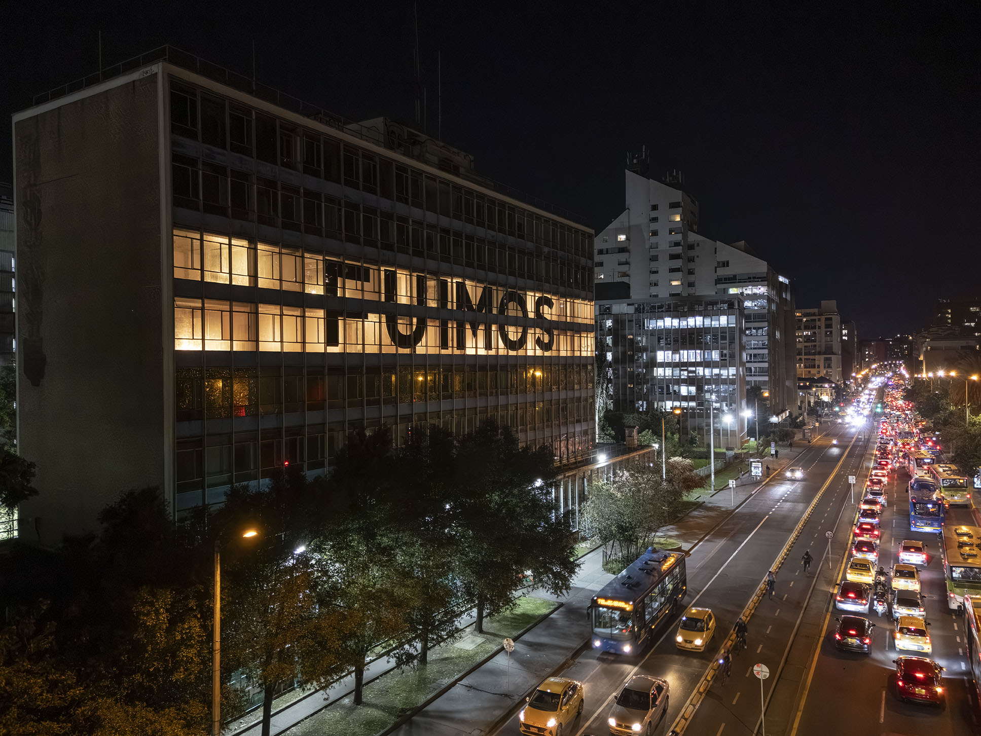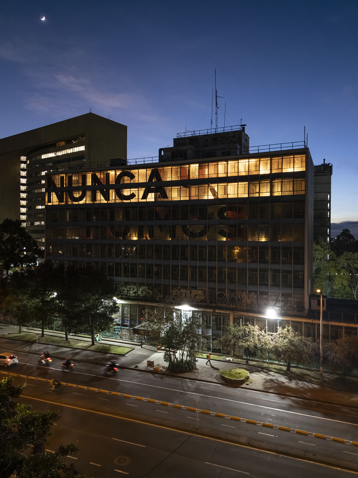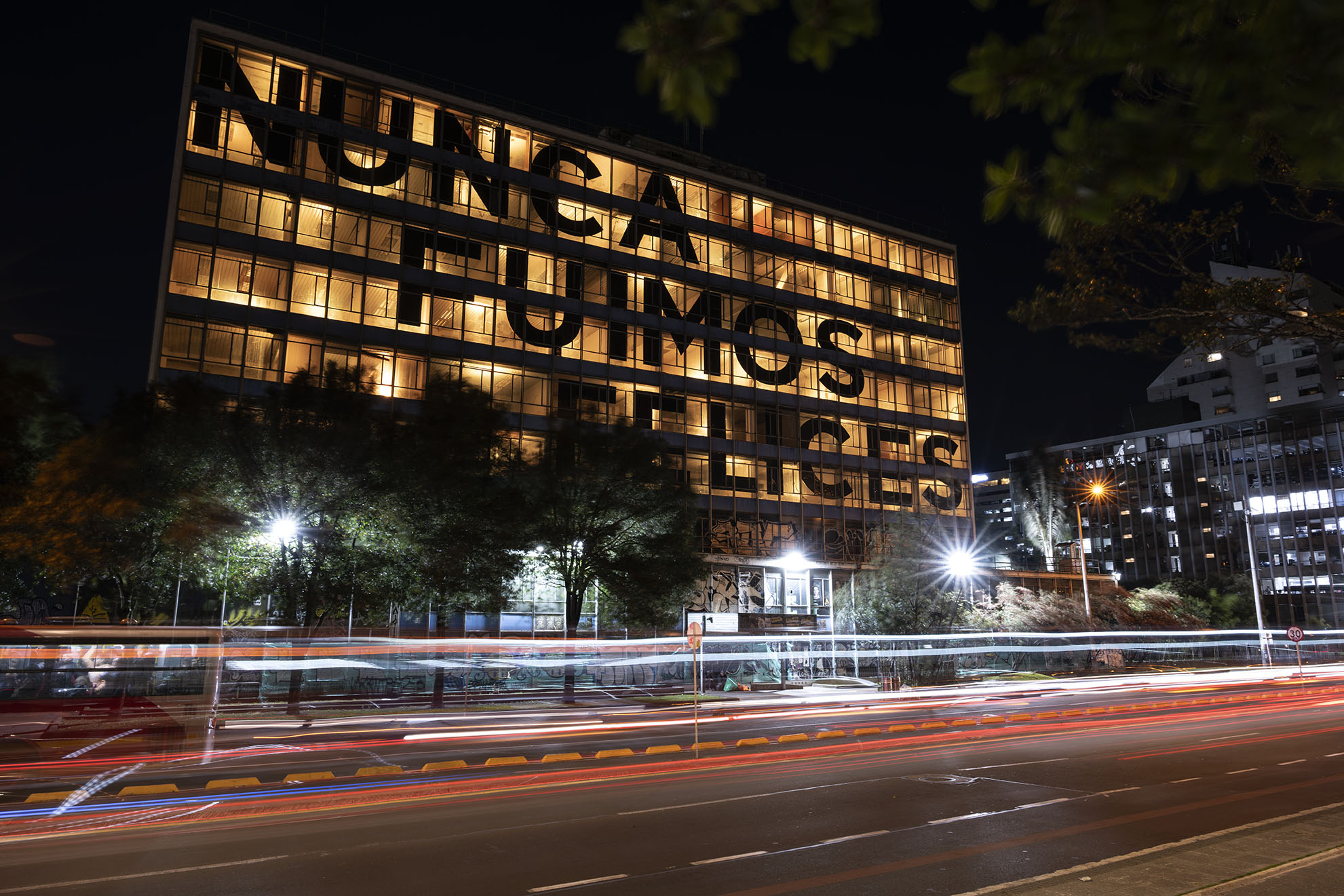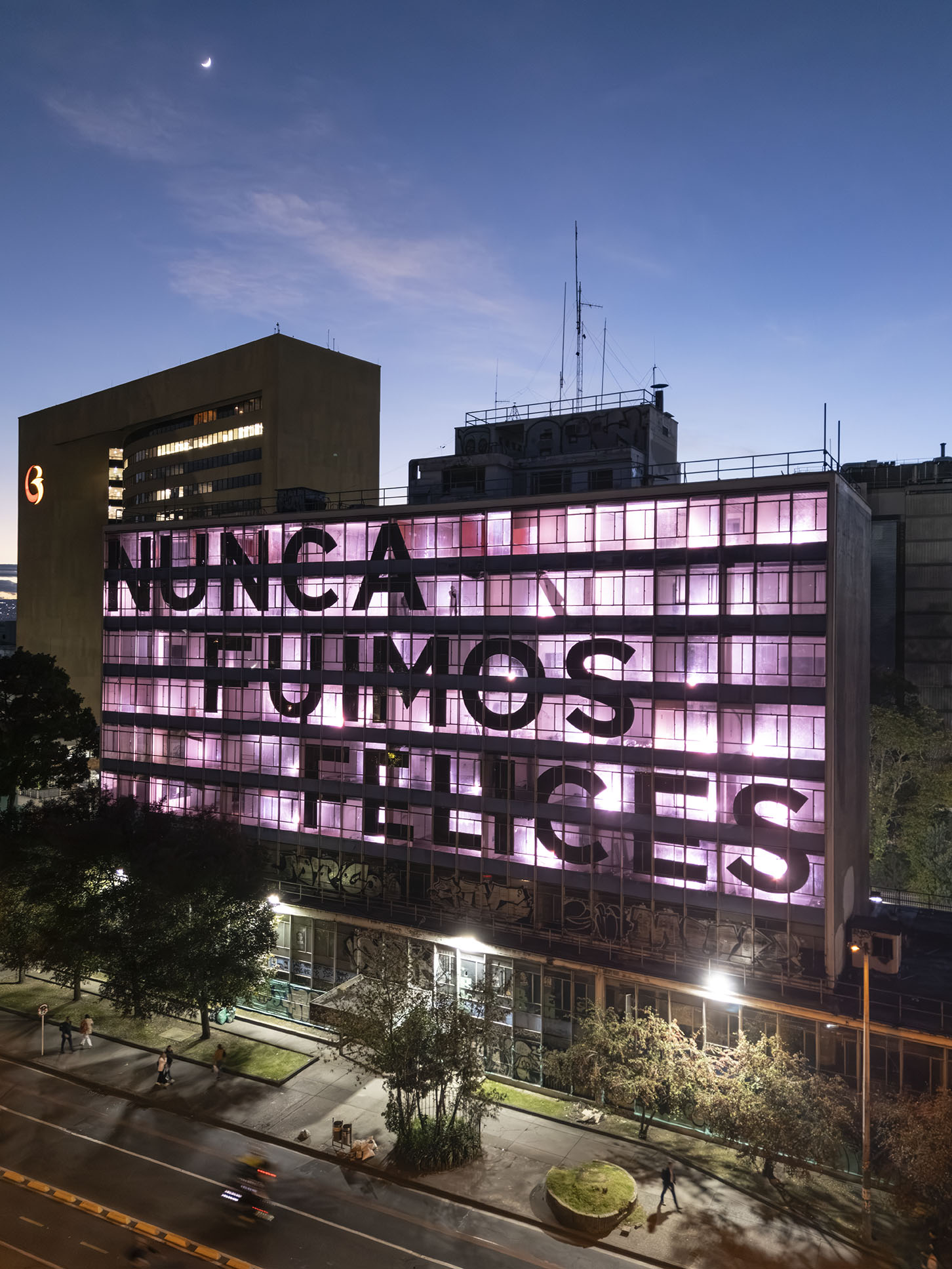 Esta instalación del artista peruano José Carlos Martinat, en colaboración con Taller Paralelo Arquitectos de Bogotá, retoma la icónica obra del artista chileno Alfredo Jaar, Estudios sobre la felicidad, quien a finales de los años setenta y comienzos de los ochenta formuló la pregunta “¿Es usted feliz?”, en varios espacios públicos en Santiago. Esta respuesta se plantea desde el icónico edificio de la CAR, sobre la carrera séptima, y que sigue siendo un símbolo de la arquitectura moderna bogotana. Hoy, es una especie de ícono mudo que mira hacia los cerros orientales, planteando esta errática yuxtaposición de sentimientos en los cuales se puede leer: "NUNCA FUIMOS FELICES", pero también, en algún momento: "FUIMOS FELICES", o simplemente: " NUNCA FUIMOS". Una pregunta que nos lleva a respuestas distintas, mientras el frenesí de la ciudad nos recuerda que vivir en Bogotá siempre será, irremediablemente, una promesa.