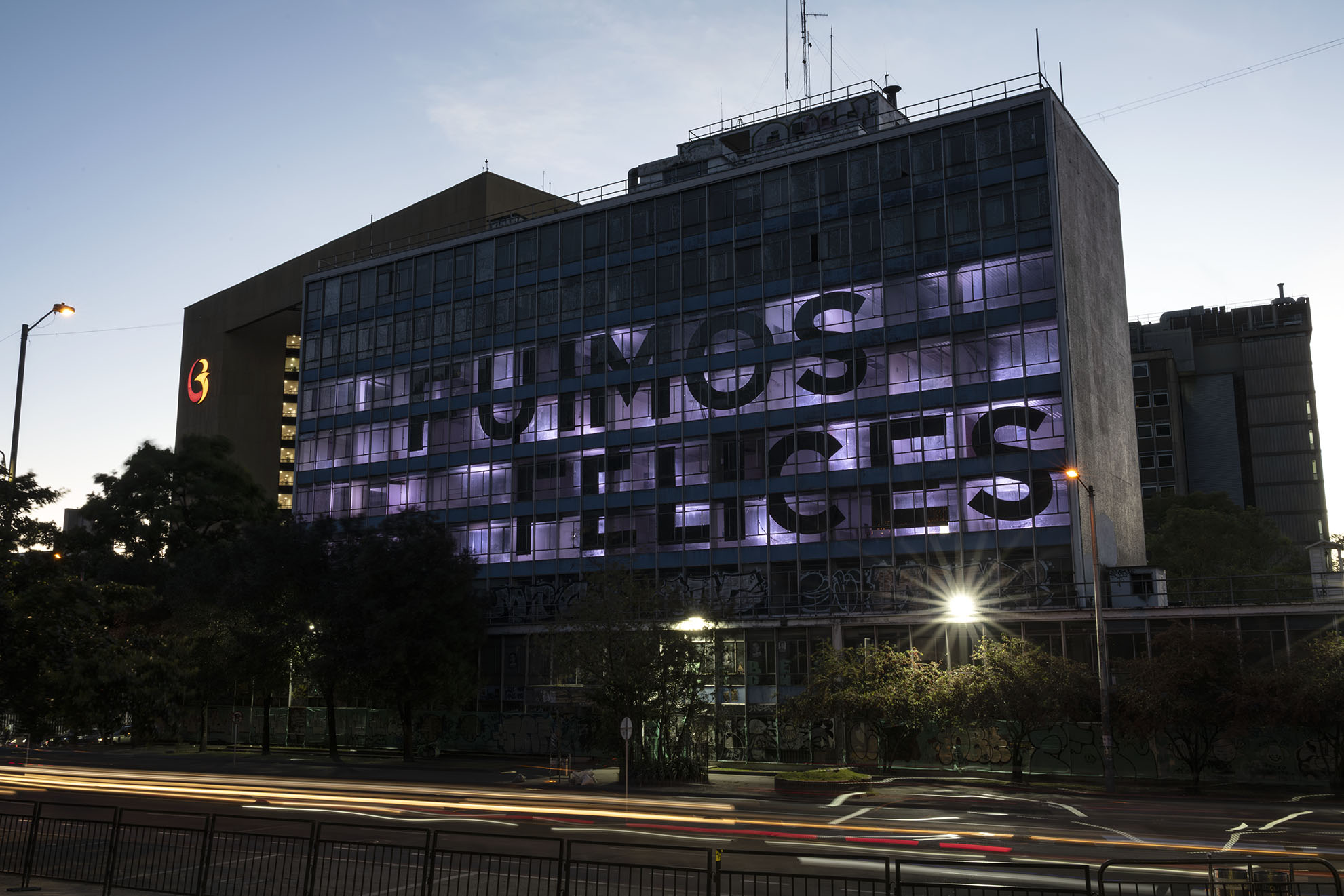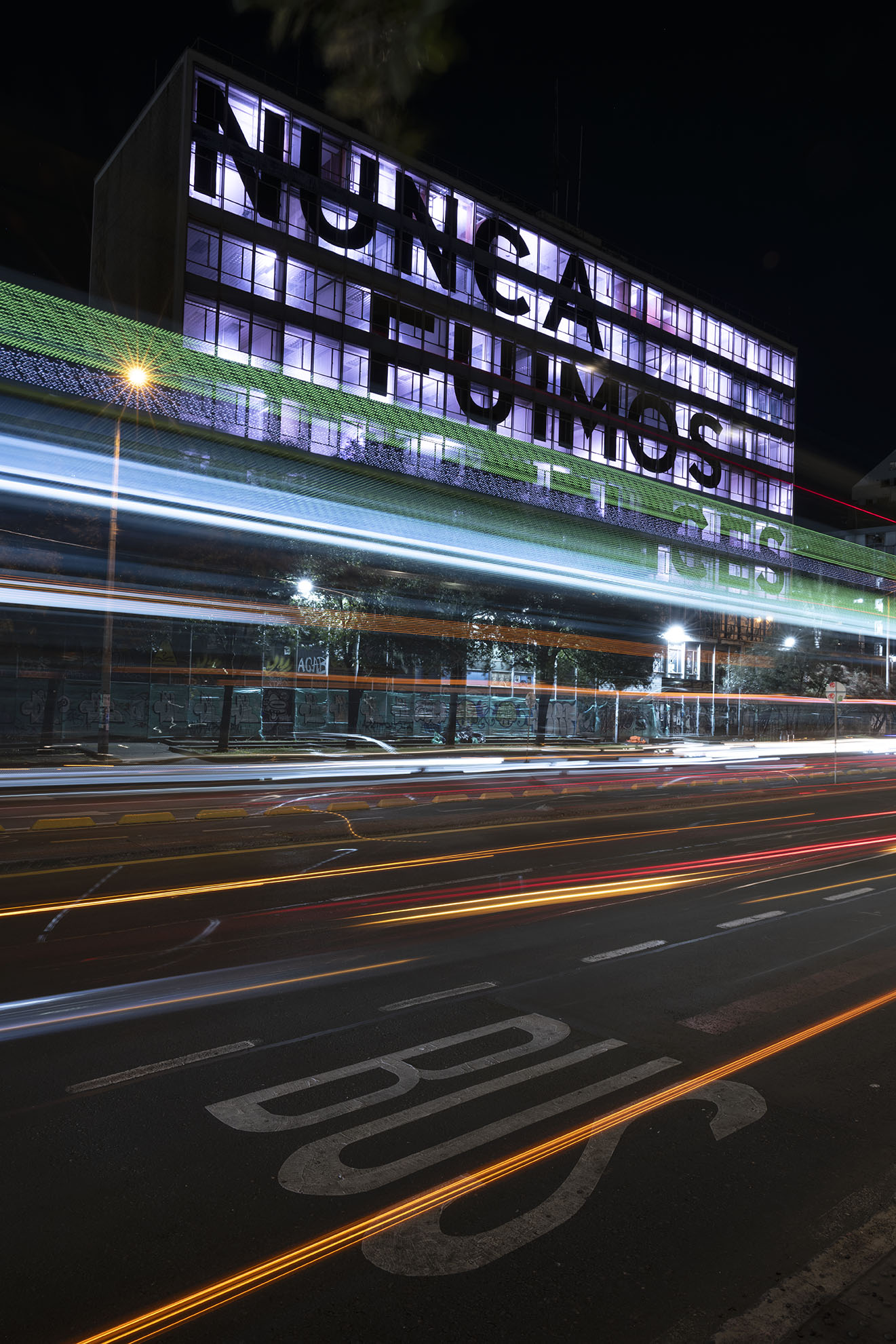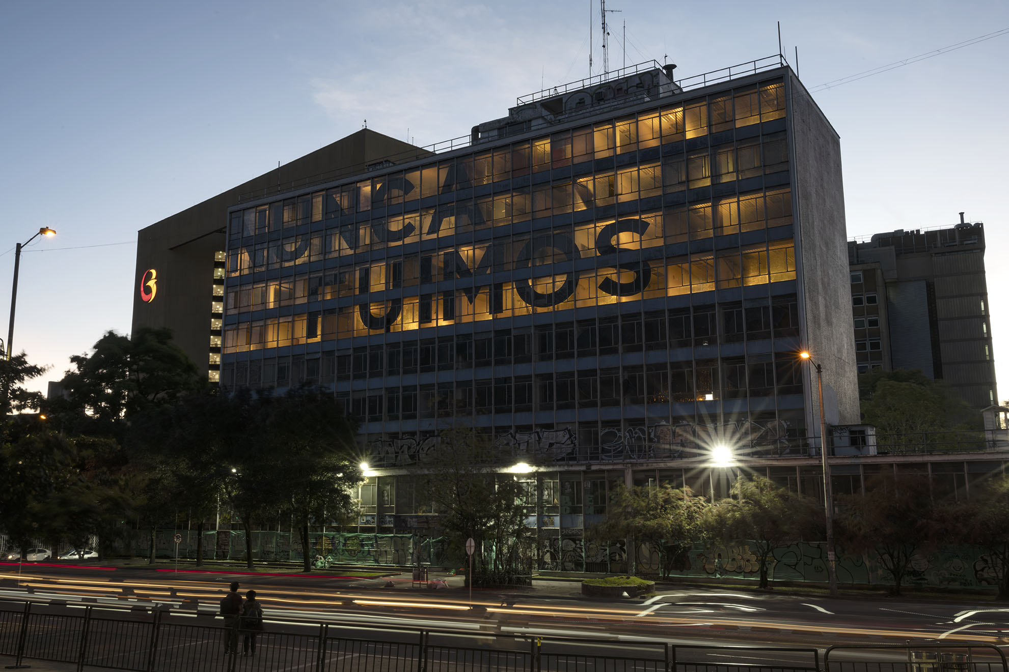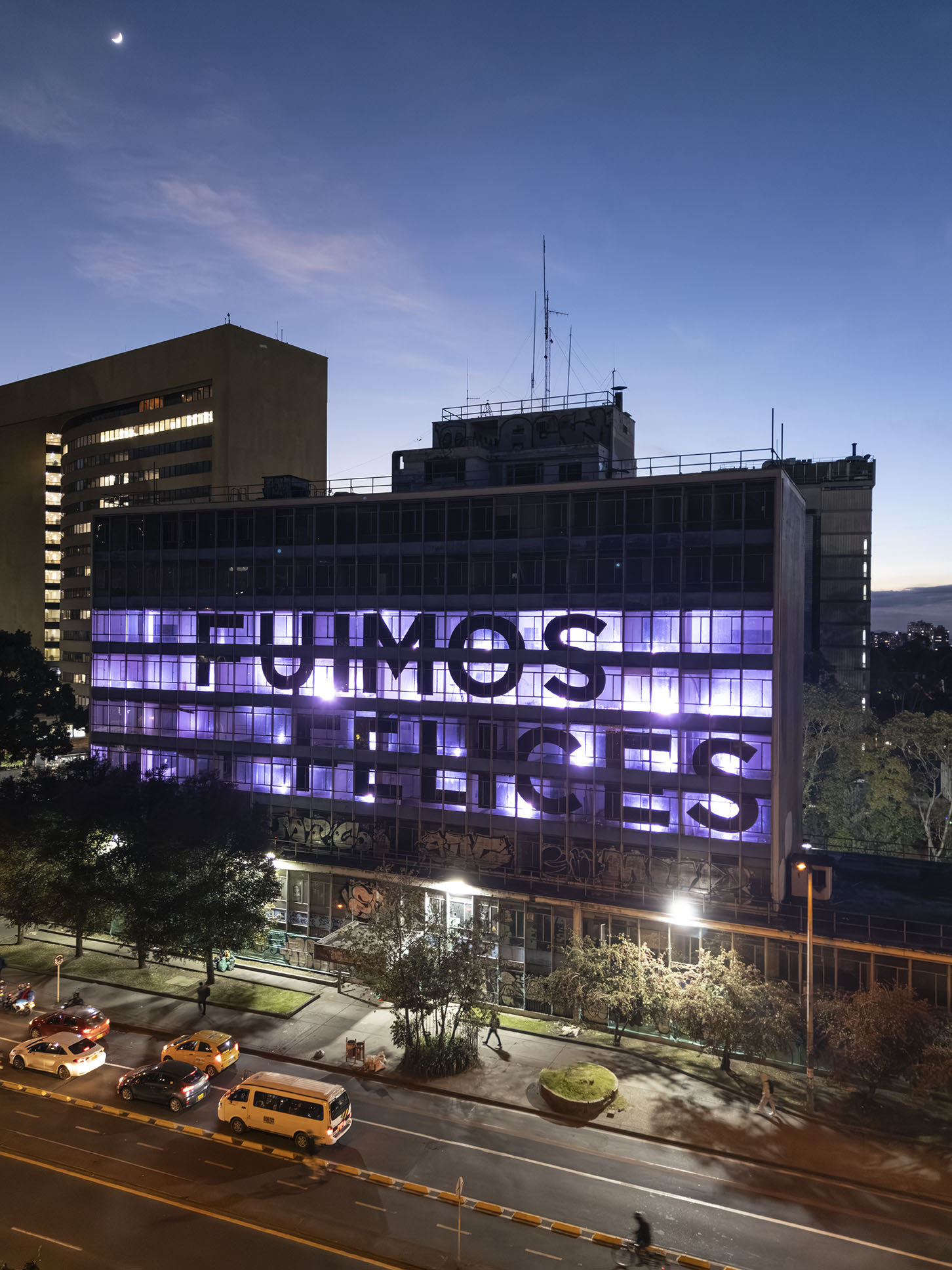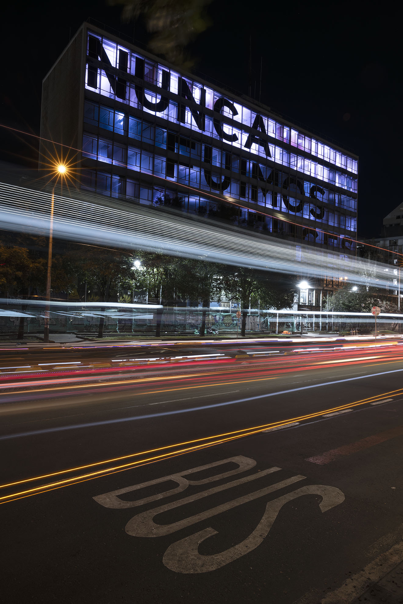 Esta instalación del artista peruano José Carlos Martinat, en colaboración con Taller Paralelo Arquitectos de Bogotá, retoma la icónica obra del artista chileno Alfredo Jaar, Estudios sobre la felicidad, quien a finales de los años setenta y comienzos de los ochenta formuló la pregunta “¿Es usted feliz?”, en varios espacios públicos en Santiago. Esta respuesta se plantea desde el icónico edificio de la CAR, sobre la carrera séptima, y que sigue siendo un símbolo de la arquitectura moderna bogotana. Hoy, es una especie de ícono mudo que mira hacia los cerros orientales, planteando esta errática yuxtaposición de sentimientos en los cuales se puede leer: "NUNCA FUIMOS FELICES", pero también, en algún momento: "FUIMOS FELICES", o simplemente: " NUNCA FUIMOS". Una pregunta que nos lleva a respuestas distintas, mientras el frenesí de la ciudad nos recuerda que vivir en Bogotá siempre será, irremediablemente, una promesa.