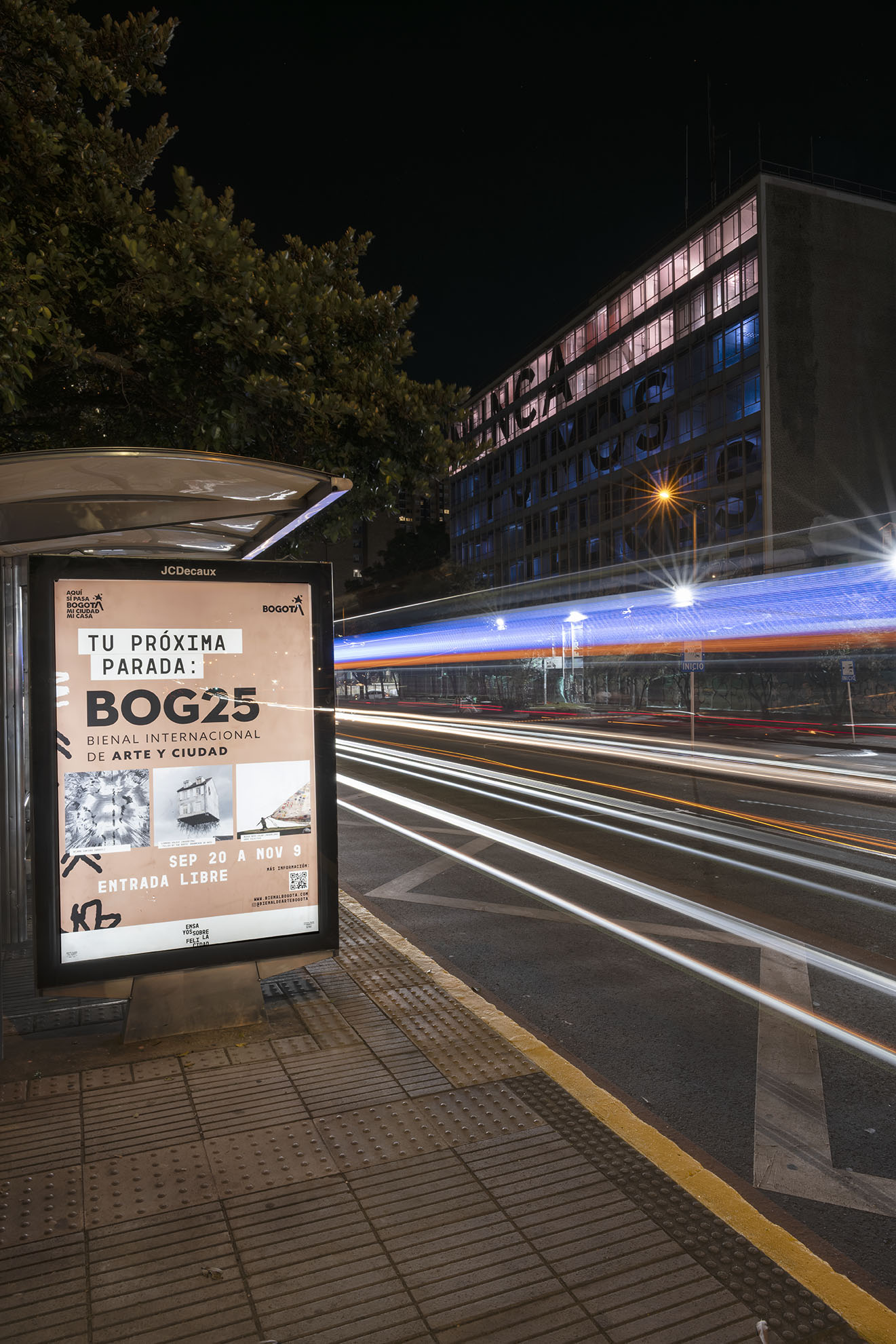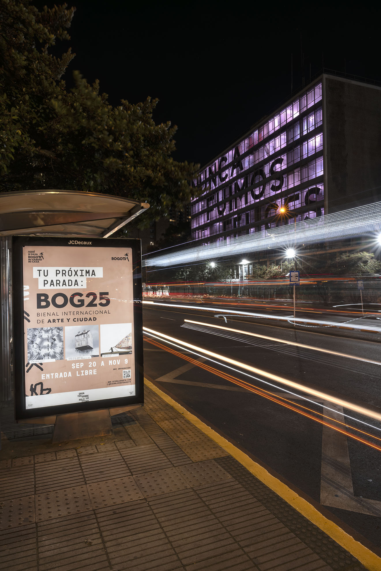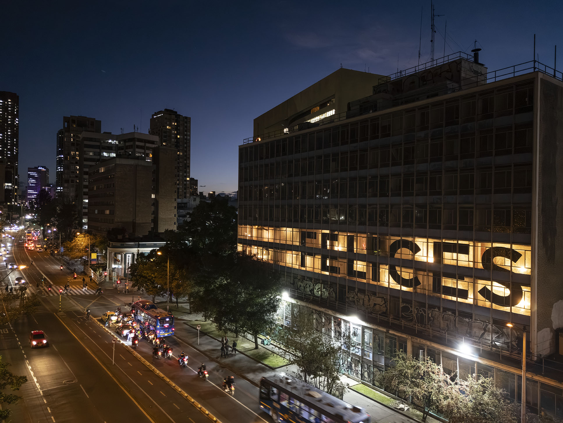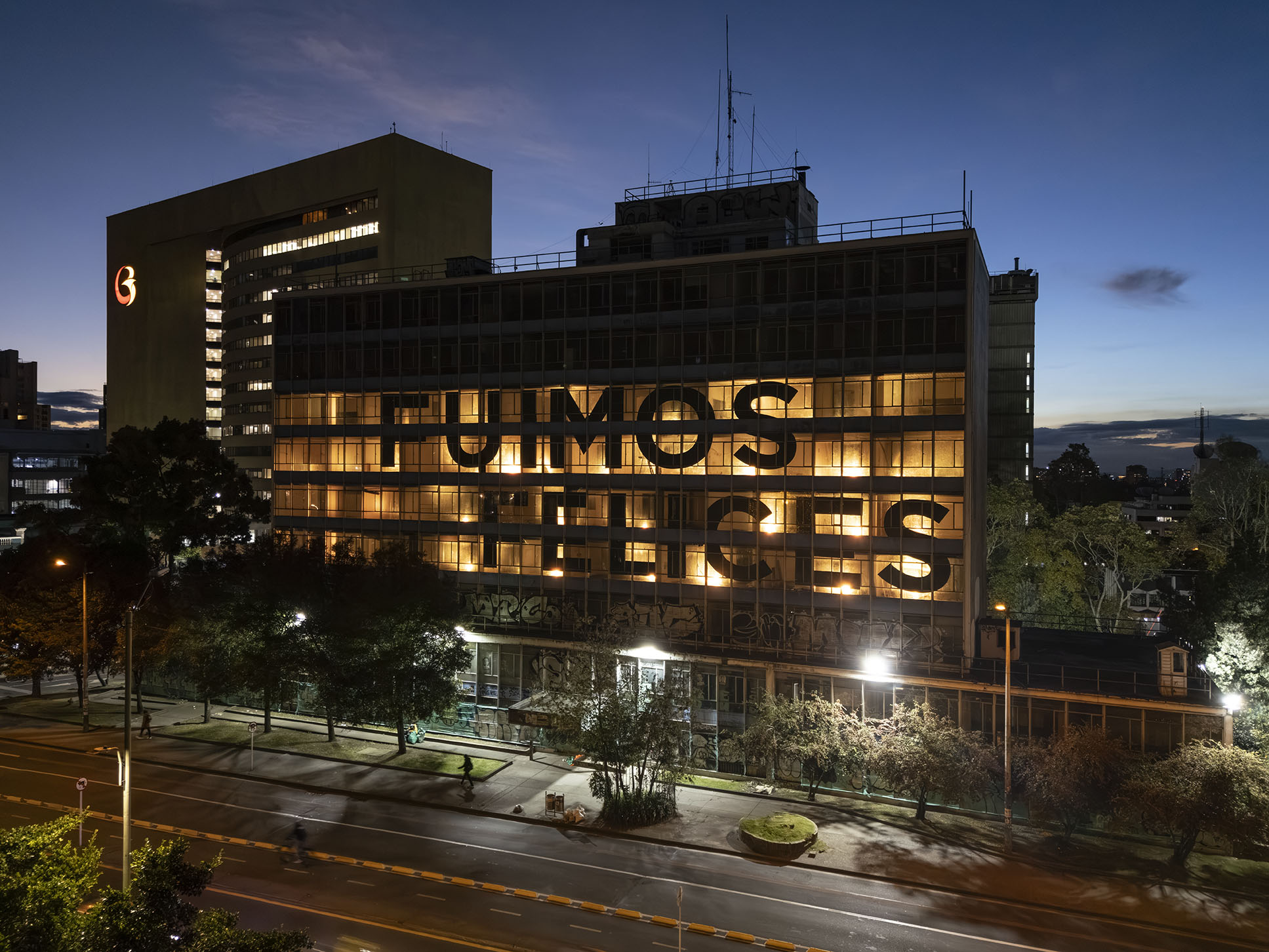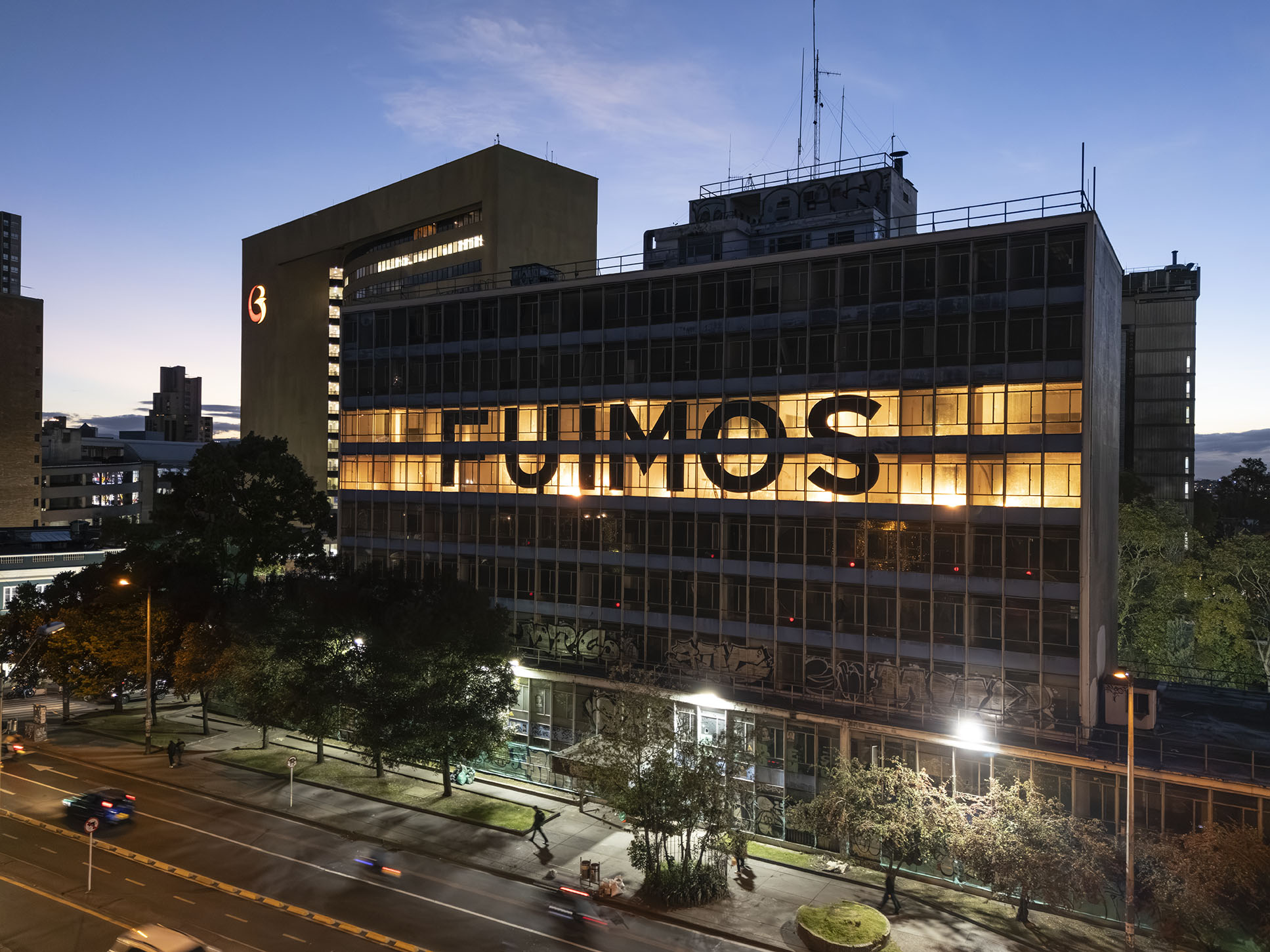 Esta instalación del artista peruano José Carlos Martinat, en colaboración con Taller Paralelo Arquitectos de Bogotá, retoma la icónica obra del artista chileno Alfredo Jaar, Estudios sobre la felicidad, quien a finales de los años setenta y comienzos de los ochenta formuló la pregunta “¿Es usted feliz?”, en varios espacios públicos en Santiago. Esta respuesta se plantea desde el icónico edificio de la CAR, sobre la carrera séptima, y que sigue siendo un símbolo de la arquitectura moderna bogotana. Hoy, es una especie de ícono mudo que mira hacia los cerros orientales, planteando esta errática yuxtaposición de sentimientos en los cuales se puede leer: "NUNCA FUIMOS FELICES", pero también, en algún momento: "FUIMOS FELICES", o simplemente: " NUNCA FUIMOS". Una pregunta que nos lleva a respuestas distintas, mientras el frenesí de la ciudad nos recuerda que vivir en Bogotá siempre será, irremediablemente, una promesa.